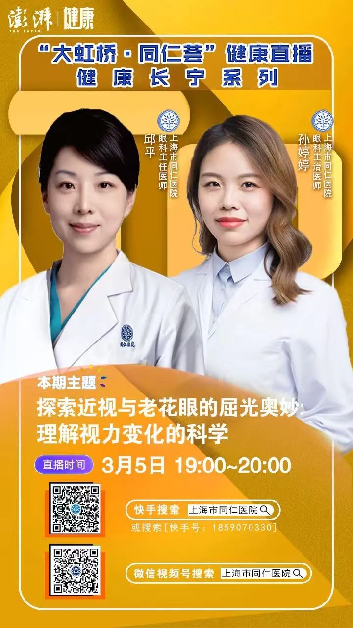 “近视眼的人不会老花”,这样的传闻是否科学?今天(3月5日)19:00—20:00,“上海长宁”APP将与上海市同仁医院“大虹桥·同仁荟健康直播”共同直播:探索近视与老花眼的屈光奥秘:理解视力变化的科学。