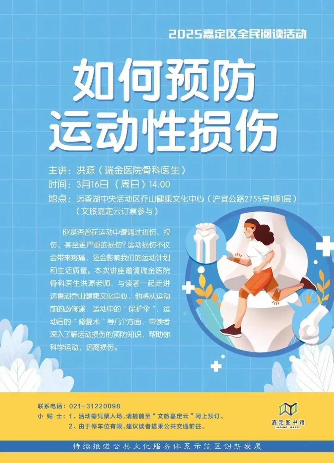 春天不减肥,夏天徒伤悲。然而,不恰当的运动方式也会导致身体超负荷,造成膝盖疼痛、肌肉拉伤、关节不适等症状。3月16日,作为2025年嘉定区全民阅读活动之一,嘉定区图书馆携手远香湖畔的乔山健康文化中心带来《如何预防运动性损伤》主题讲座,邀请瑞金医院骨科主治医师洪源担任主讲嘉宾,带来让运动爱好者们如何健康“变强”的新鲜干货。