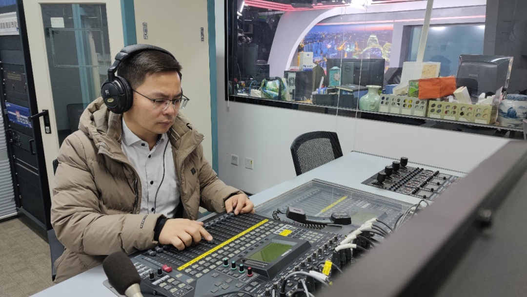 技术保障团队在前方演播室调试音频设备