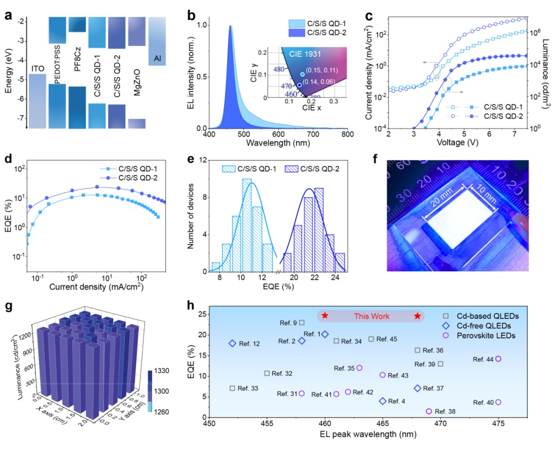 量子点显示以其更为优秀的色彩表现力,已成为引领新型显示产业迭代升级的关键驱动力之一。近期,科学家们对誉为终极量子点显示技术的电致发光量子点发光二极管的研究与探索持续发力,取得了令人瞩目的突破性进展。目前,红、绿光QLED性能已能够与商业有机LED (OLED)相媲美。而相比之下,由于更高的工作电压及需要克服更大的空穴注入势垒等原因,导致蓝光QLED器件性能进展落后,尤其是环境友好型的无重金属器件的发展更为迟缓,严重阻碍了QLED显示技术的商业化进程。