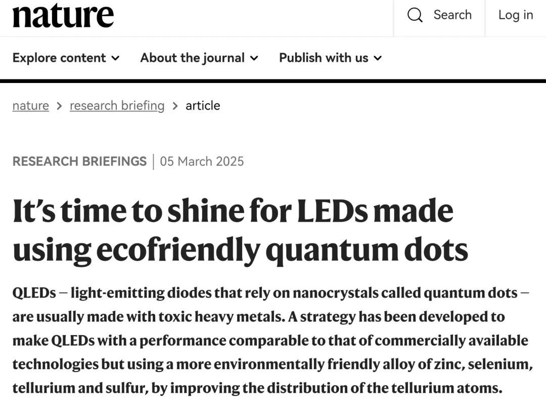 杨绪勇教授受邀为《Nature》杂志撰写了题为“It s time to shine for LEDs made using ecofriendly quantum dots” 的Research Briefing文章(Nature, https://doi.org/10.1038/d41586-025-00640-z),该Research Briefing和Nature研究工作同天上线。被誉为“量子点艺术家”的韩国成均馆大学Eunjoo Jang教授(原韩国三星先进技术研究院研究员)对该Nature工作点评:“所研发的QLED性能是非常引人注目的,其高的效率和长的寿命已超过了先前报道的器件性能。”(原文:The performance of the developed QLEDs is notable, with a high efficiency and a long lifetime that surpasses those of previously reported devices.)《Nature》应用物理科学主编Karl Ziemelis也给予该工作高度评价:“文章的魅力在于作者们研发了一种抑制组分不均匀的策略制备了非镉量子点,实现了与最好Cd基蓝光LED媲美的高效率、长寿命和光谱纯正的器件。”(原文:The appeal of this paper is that the authors have developed a strategy for preparing Cd-free quantum dots that suppresses compositional heterogeneities, enabling devices with efficiencies, lifetimes and spectral purities that rival the best Cd-based blue LEDs.)