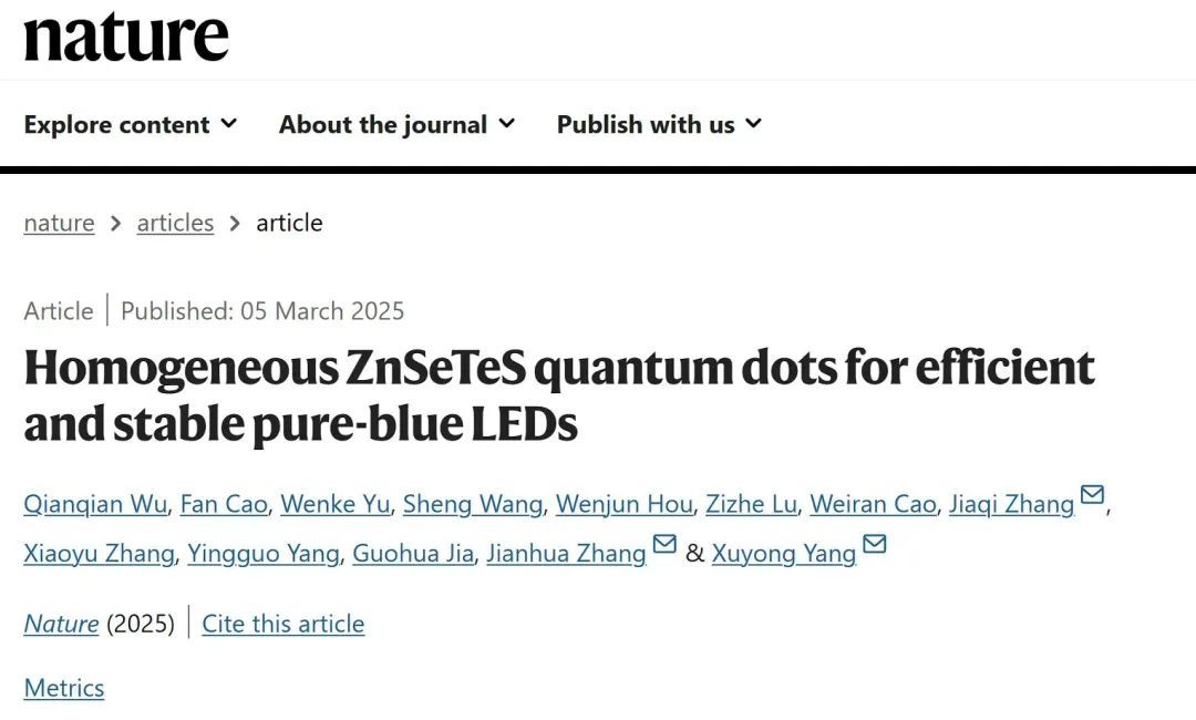 3月5日,上海大学新型显示技术及应用集成教育部重点实验室杨绪勇教授、张建华教授团队联合吉林大学张佳旗教授团队以“Homogeneous ZnSeTeS Quantum Dots for Efficient and Stable Pure Blue LEDs”为题,在国际顶级学术期刊《Nature》上发表关于环保型蓝光量子点发光二极管(QLED)的突破性研究文章。论文链接:https://www.nature.com/articles/s41586-025-08645-4