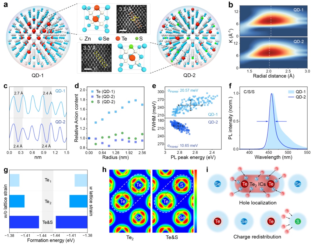ZnSeTe量子点被视为环保型蓝光量子点的理想之选,但其存在活泼金属Te(Ten≥2)易聚集的现象,由此产生的等电子中心引起了较低能量的尾部缺陷发射,严重降低了其发光效率、色纯度及稳定性。该研究揭示:Te前驱体(如TOP-Te)相比于Se-类似物的高反应活性导致了合金量子点中富Te和贫Te区域的不均匀分布,从而产生带隙差异引起的光谱变宽。量子点富Te区域的堆垛层错也降低了辐射复合和量子点晶格稳定。尤其,ZnSeTe量子点中相邻的Te原子会形成等电子中心,产生短程势作用力以捕获空穴,并进一步诱导形成价带顶上方的深空穴局域态吸引电子形成激子,产生了较低能量的尾部发射,致使量子点的色彩表现和稳定性变差。