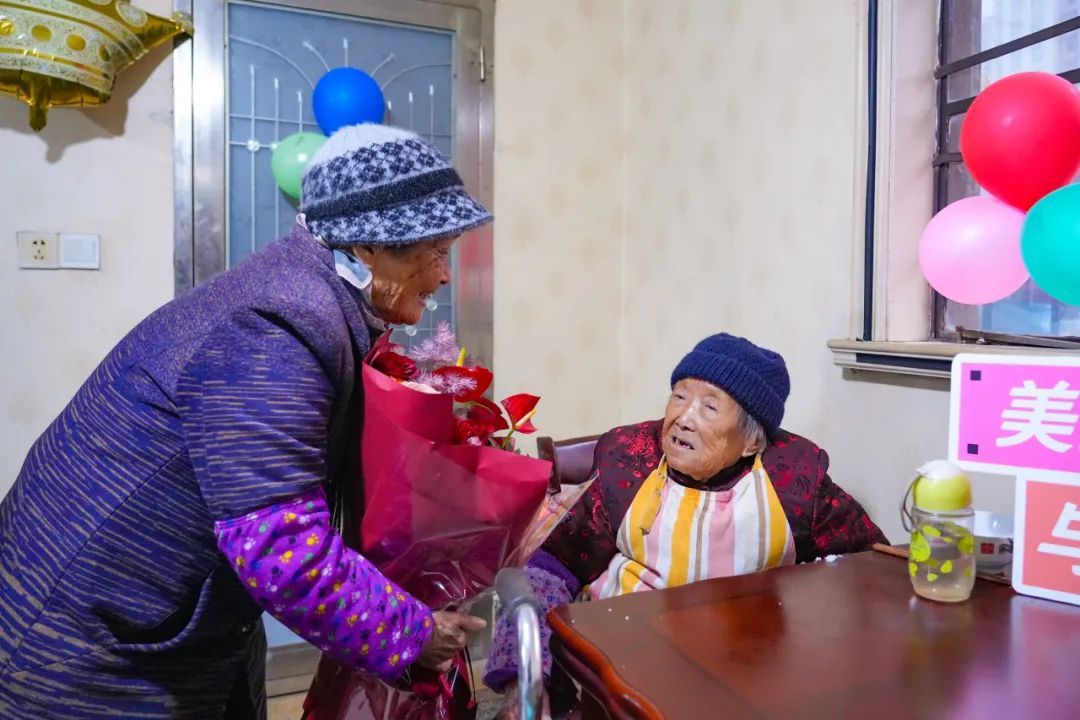 上午8点多,百岁老人郁品娟家中就已经格外热闹,不少人陆续到来为郁阿婆送上生日祝福。94岁的夏品芳是郁阿婆过去的同事,由于身体原因,她已经好久没有和郁阿婆见面了。得知今天是郁阿婆的生日后,她特意带着鲜花上门祝福。