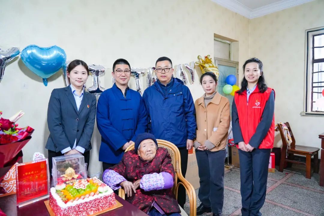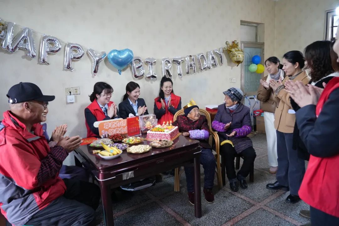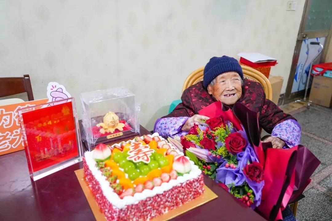 山中常有千年松,世上难逢百岁人。3月3日上午,柘林镇南胜村的郁品娟老人迎来了她的百岁寿辰,南胜村村委会的工作人员提前布置场地、订购蛋糕和礼物,为郁阿婆精心筹备了一场特别的生日会。