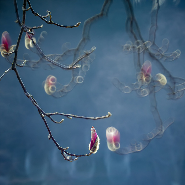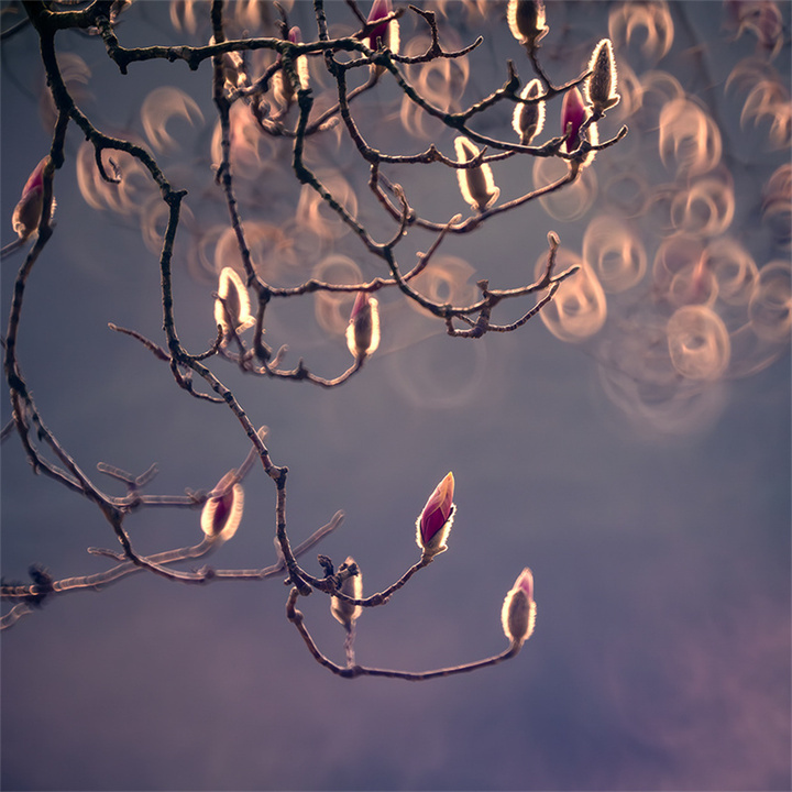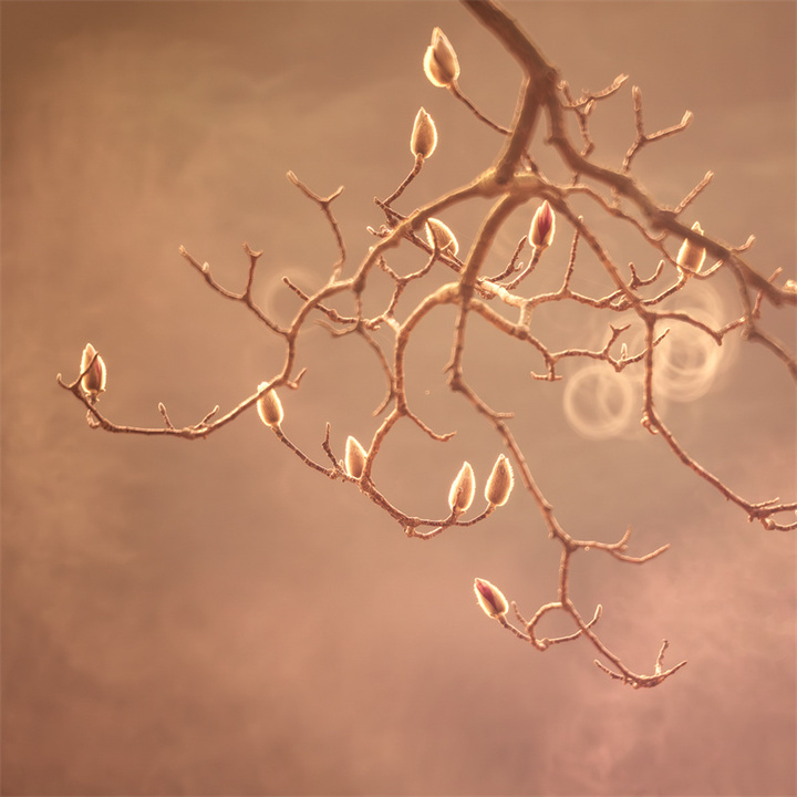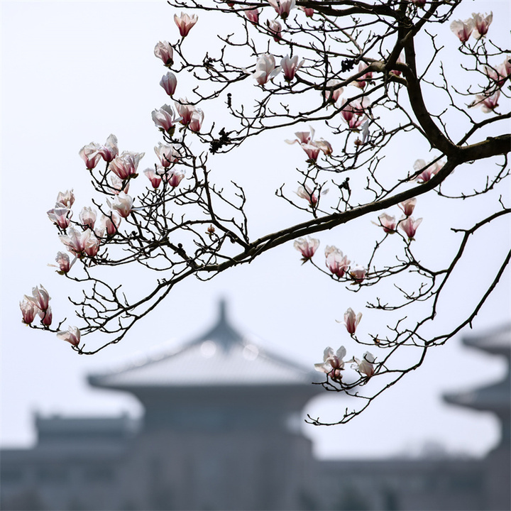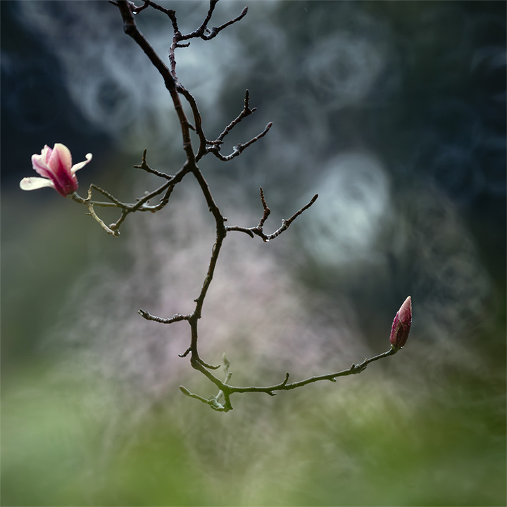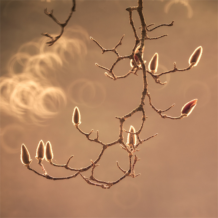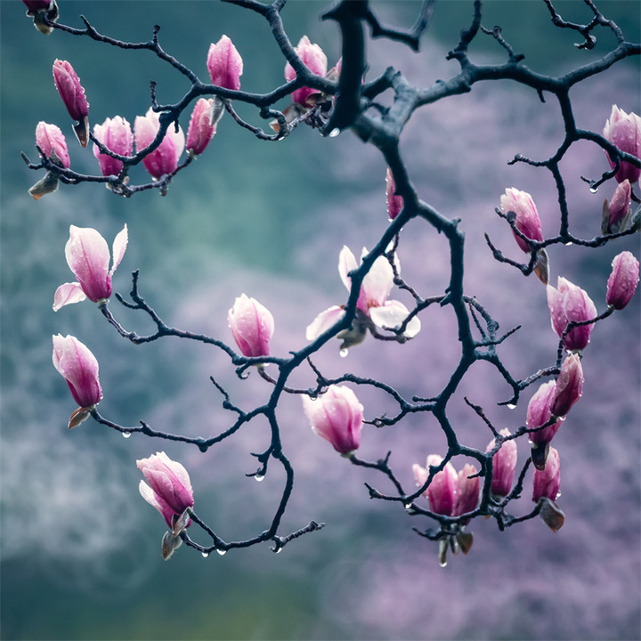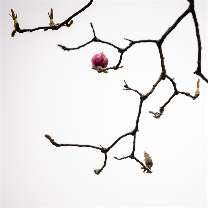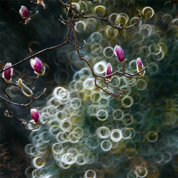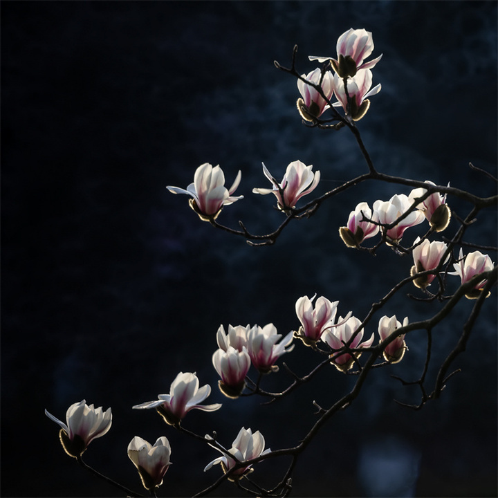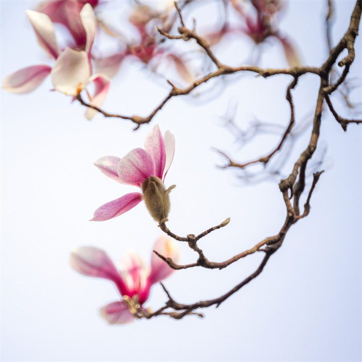 拍摄玉兰花的天气和时机可以多样化,既可以选择日出、日落的逆光,也可以选择阴雨天的散射光。拍摄的镜头可优先选择70-200mm或100-500mm长焦镜头,利用长焦镜头压缩背景,突出花与枝干的线条感。折返镜头因其独特的成像效果和焦外二线性也是不错的选择。