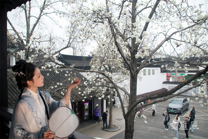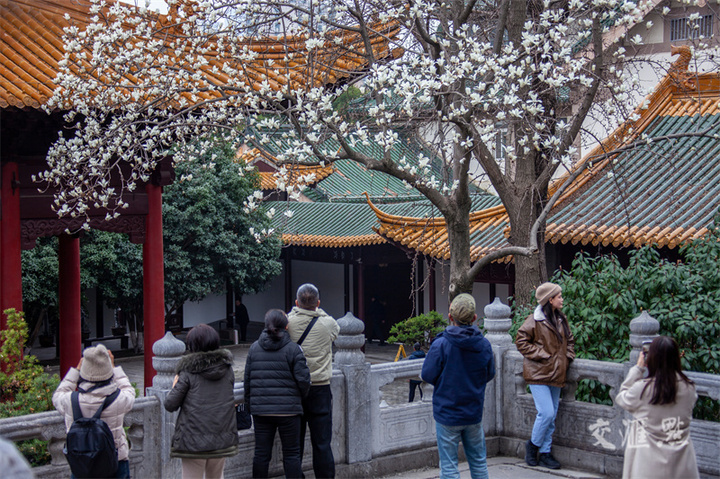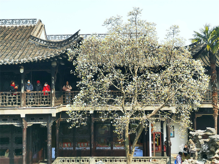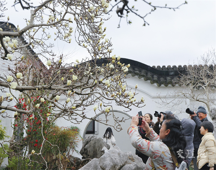 3月6日,扬州何园白玉兰初绽,吸引游客和市民观赏拍照。张忠摄 视觉江苏网供图