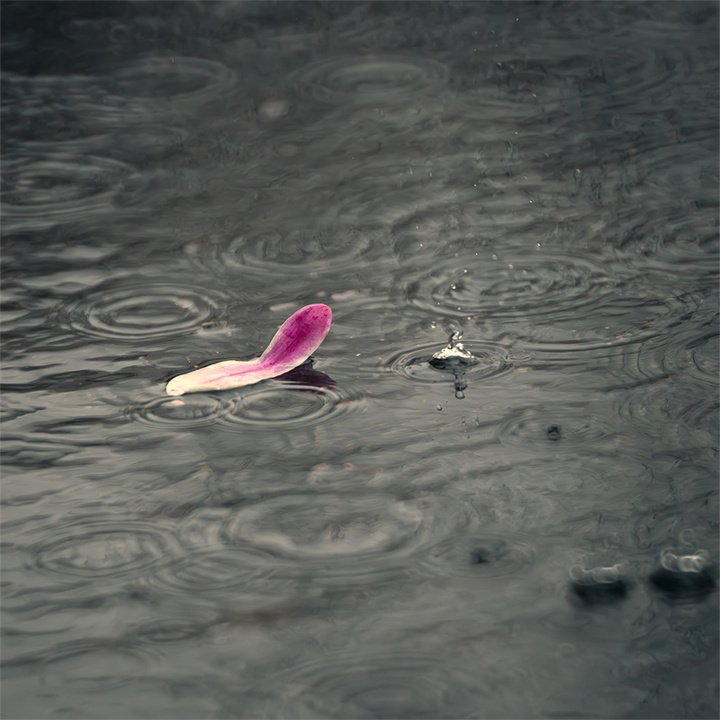 雨天拍摄时动态与意境相结合,利用长焦镜头特性,既能虚化雨幕为柔焦背景,又能保留雨滴轨迹。快门速度建议:1/200s凝固雨滴,1/60s营造雨丝拉丝效果。尝试以深色树干或建筑为背景,增强雨丝可视度。如想捕捉花蕊绒毛与水珠折射的光斑,建议手动对焦更加精准,选取花瓣边缘悬挂的水滴作为视觉焦点,背景可虚化为彩色光斑。