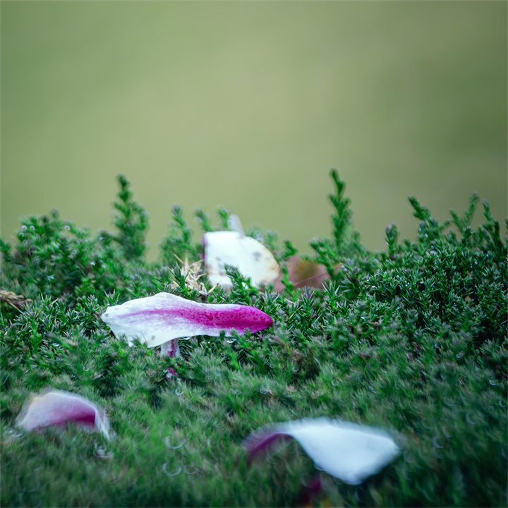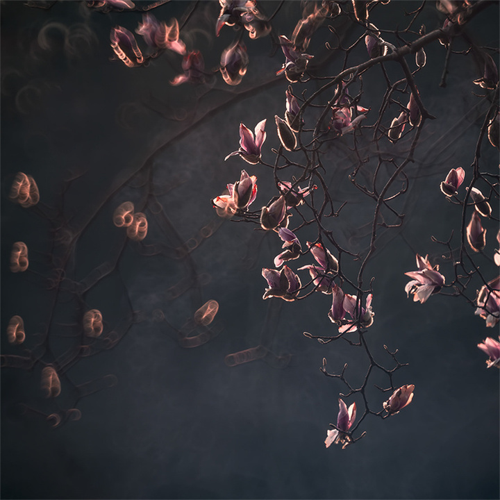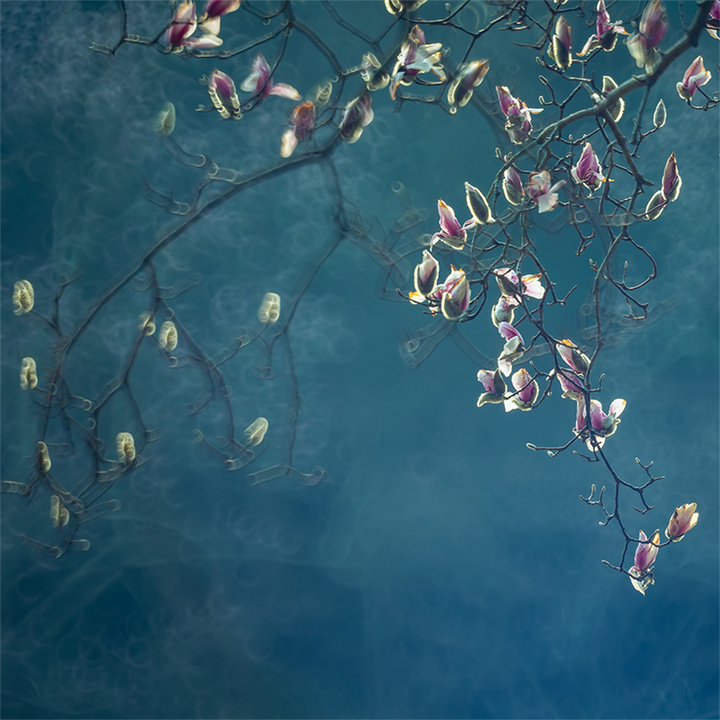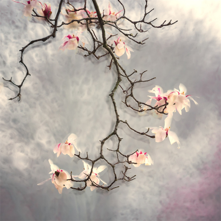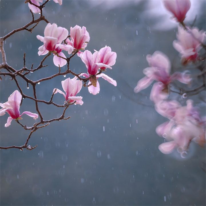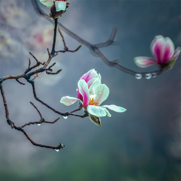 阴天时均匀散射光适合表现玉兰的素雅气质,可以带着后期的想法进行前期拍摄,强化冷调氛围。推荐采用RAW格式,方便后期调整时恢复暗细节和控制高光部位,调色时可以利用补色原理大胆地对色温进行调整,也可尝试利用分离色调调整方式,高光加青蓝(色相220,饱和度10),阴影保留暖棕(色相35,饱和度5),增强古典感。