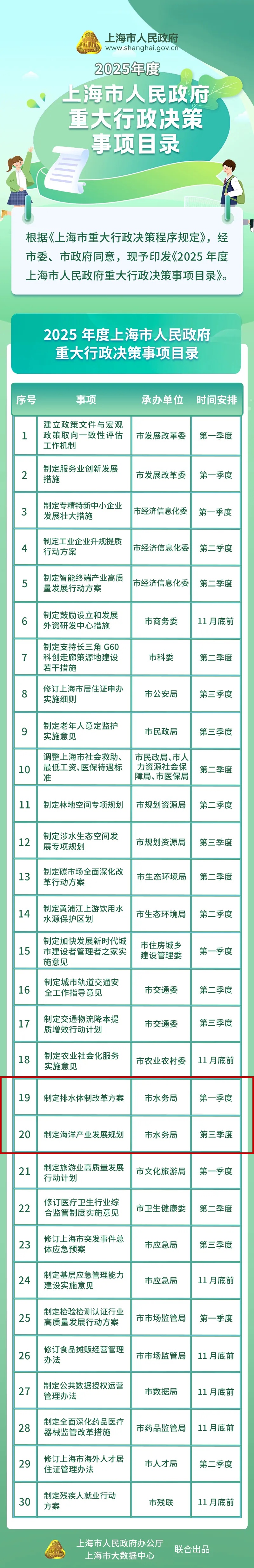 为落实重大行政决策程序制度,上海市人民政府办公厅编制了《2025年度上海市人民政府重大行政决策事项目录》,内容包括制定服务业创新发展措施、交通物流降本提质增效行动计划等。详见↓
