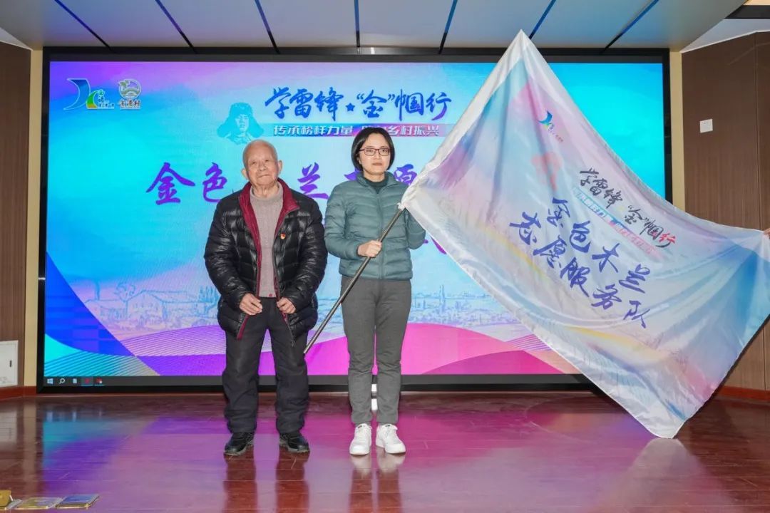 金港村女性志愿者服务队伍——金色木兰志愿服务队正式成立,全国优秀共产党员陈火培上台授旗,金港村非公企业联合支部书记郑吉接过这面象征着志愿和奉献的旗帜。