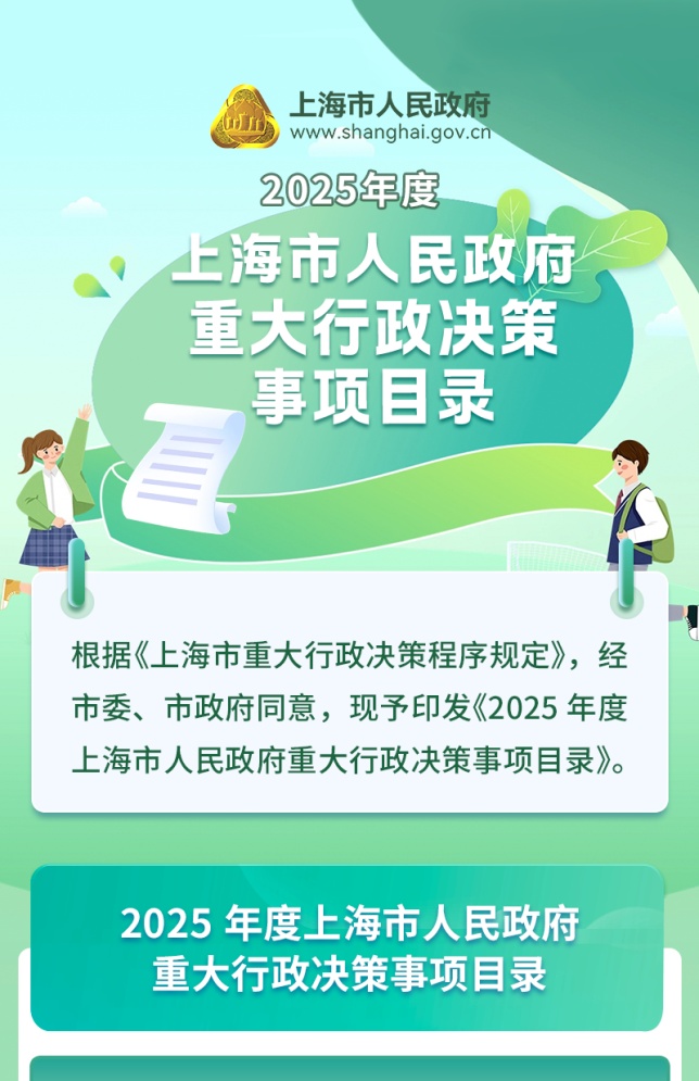 为落实重大行政决策程序制度,上海市人民政府办公厅编制了《2025年度上海市人民政府重大行政决策事项目录》,内容包括制定服务业创新发展措施、交通物流降本提质增效行动计划等。详见↓