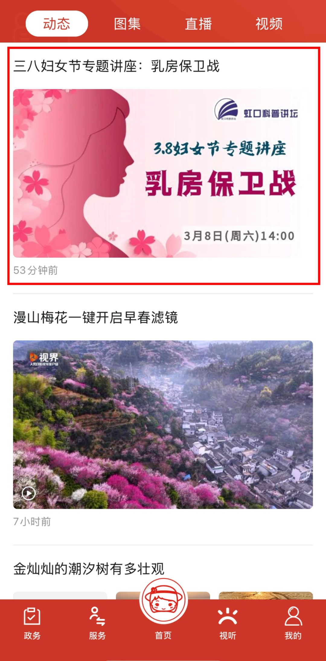 ②在APP“视听”板块找到“动态”,点击进入该场直播