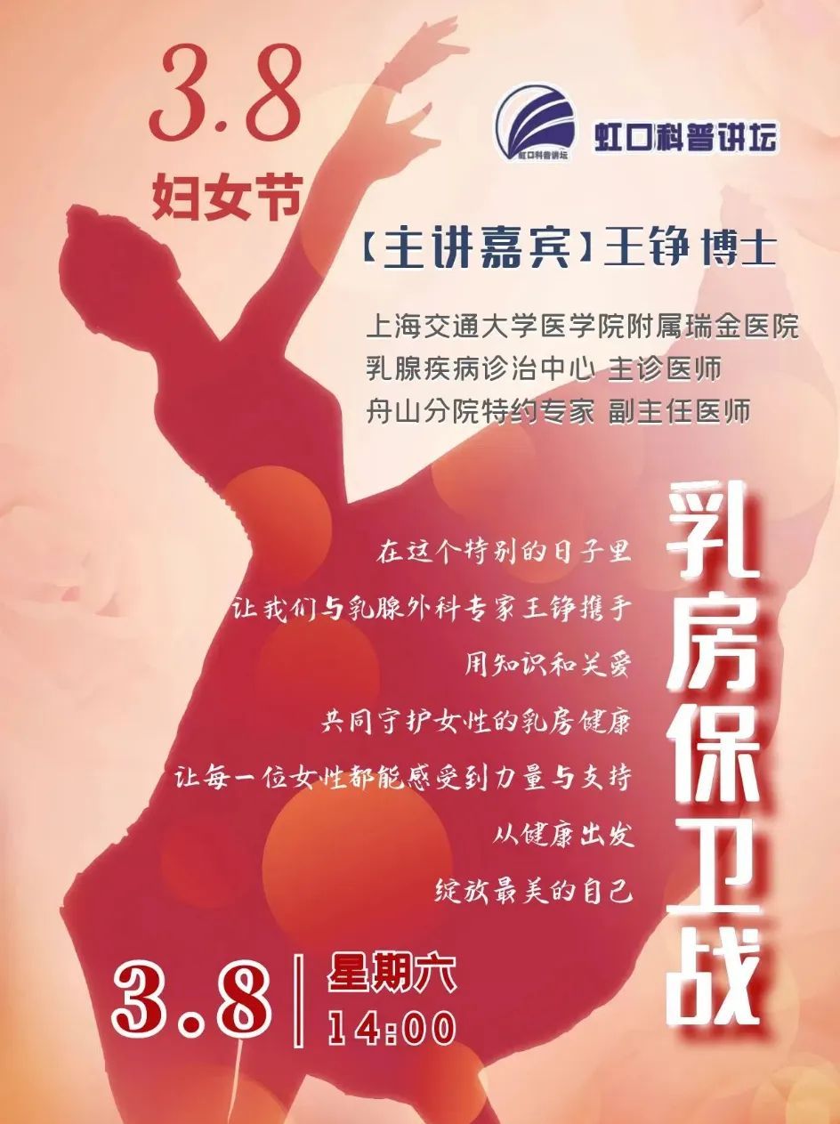 3月8日,“虹口科普讲坛”将邀请上海交通大学医学院附属瑞金医院乳腺疾病诊治中心主诊医师王铮,为大家带来女性健康专题讲座。本次讲座将从乳房疼痛、乳腺结节、乳腺肿瘤等话题入手,全面剖析乳腺健康的原理,以专业的视角、生动的案例以及实用建议,帮助大家深入了解乳腺疾病的本质与防治之道,并结合瑞金医院乳腺中心的实践经验与研究成果,为大家提供前沿的乳腺健康保健理念与方案。