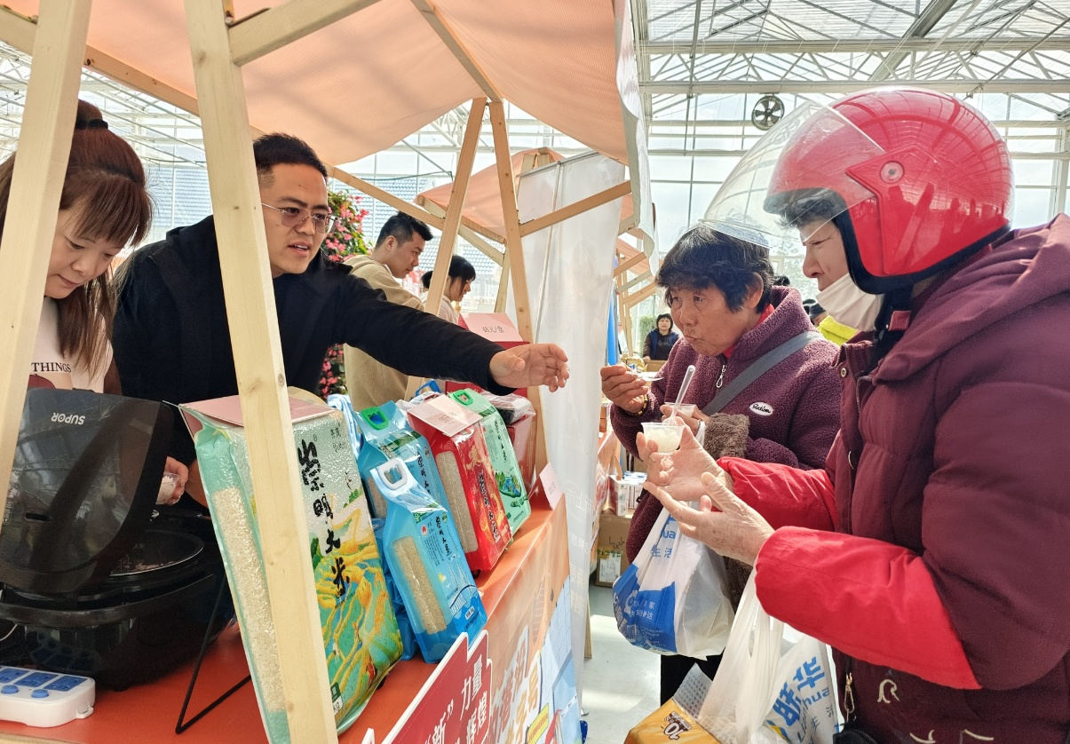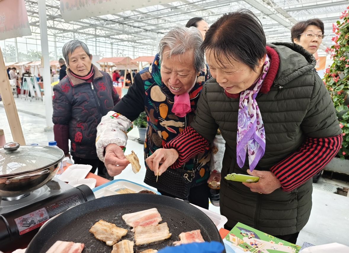 现场,不少“摊主”还在摊位前摆上了试吃品,吸引市民品尝购买。滋滋作响的烤肉、热气腾腾的花果茶,让人胃口大开。“这猪肉吃起来肥而不腻,挺香的。先买一盒尝尝看,觉得好吃再买一些。”市民陶先生说。