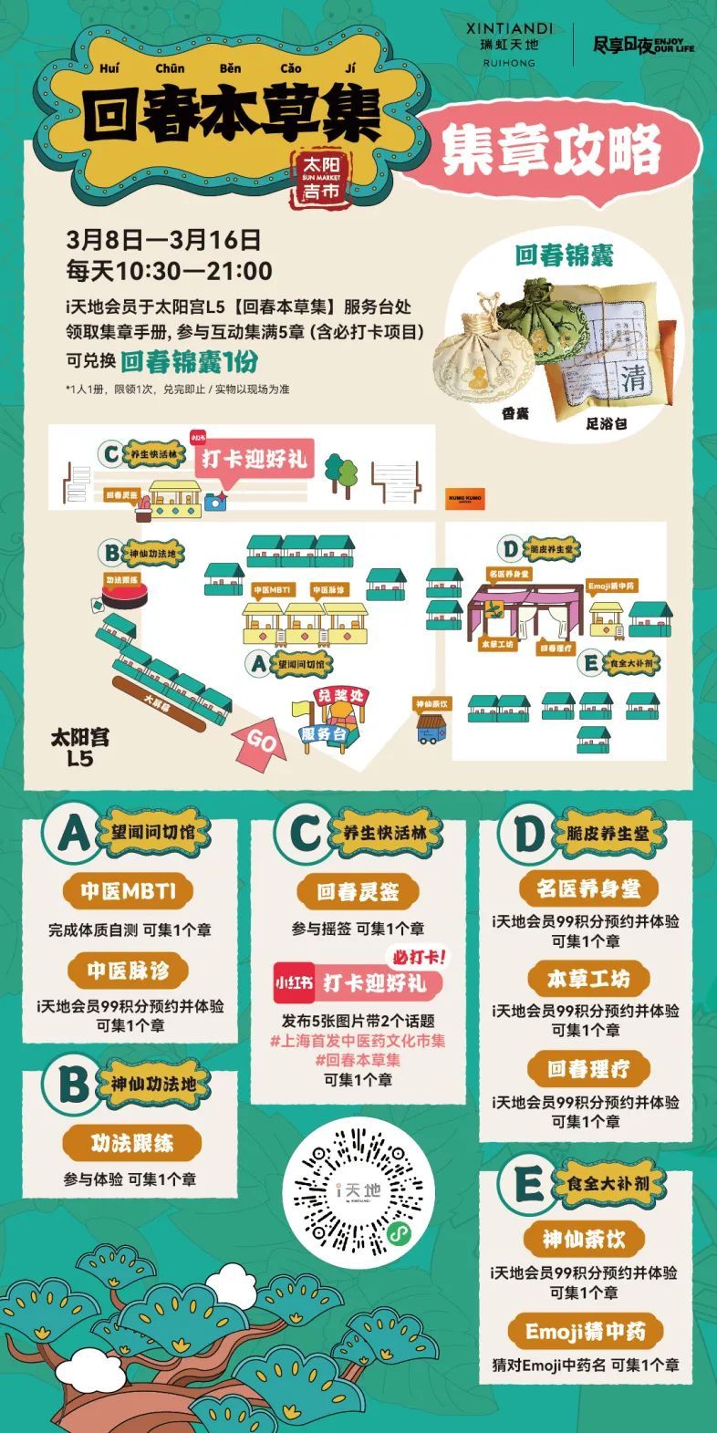 来到太阳宫5楼中庭的服务台领取打卡地图,就可以开始属于你的养生之旅啦!驻足聆听名医讲解养生之道、亲手制作香囊、跟随八段锦的节奏舒展筋骨,跟着在国风拍照区打和养生游戏互动区完成打卡体验,好逛好玩还能收获健康。