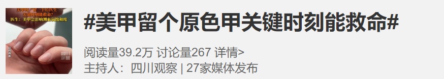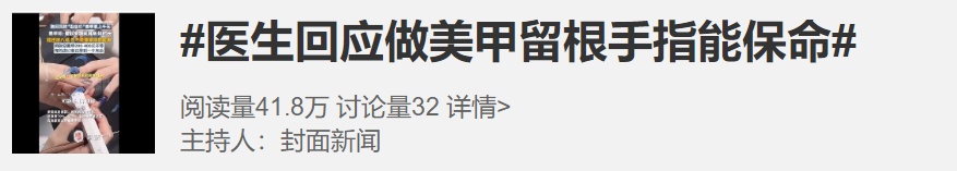 面对美甲的风靡,有医护人员表示,美甲在某些特定的情况下,可能会对医疗检查造成一定程度的干扰。尤其是当医生需要通过仔细观察指甲的颜色、形状以及质地等方面的特征,来综合判断患者的健康状况时,美甲的存在可能就会成为一个阻碍因素。遇到紧急情况,“裸露”一根指甲,甚至可以保命。