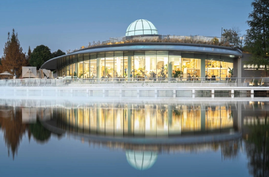 据了解,江南书局·疁城之瞳位于远香文化环建筑小品“碟坞”之中的“疁城之瞳”,总建筑面积1255.35平方米,总景观面积1900平方米,由新华传媒打造。自2023年11月启幕以来,江南书局·疁城之瞳凭借其依水而建、水景交融的独特建筑设计,以及融合书店、轻食餐饮、文化创意产品、文化展览与互动体验的新型商业模式,赢得了广大市民的热烈追捧。