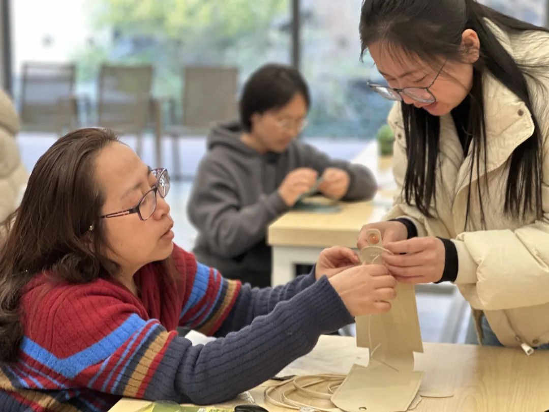 手工皮具不仅仅是一件物品,它承载的是制作者的情感与故事。现场,大家精心挑选皮料颜色与款式,有的手持裁刀,小心翼翼地裁剪皮料;有的专注于打孔与穿线,力求在每个细节上都展现出完美的工艺。在老师的悉心指导下,一个个精美的手机包逐渐成形。大家迫不及待地拍照、分享制作心得。