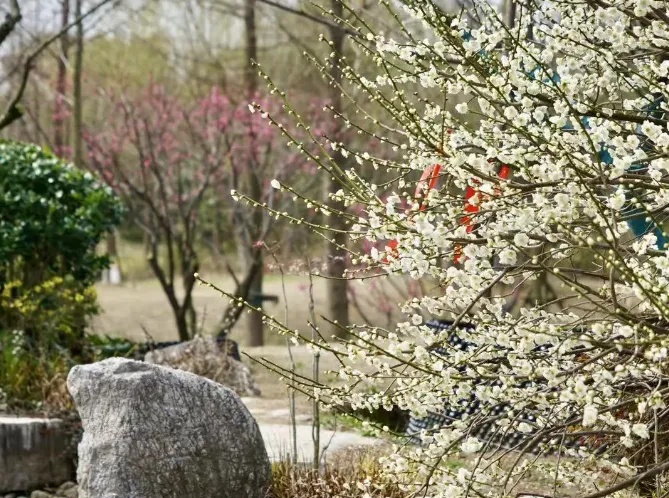 东平国家森林公园里,照水梅、榆叶梅、白梅、红梅恣意绽放,香味扑鼻,营造出一片片世外桃源。