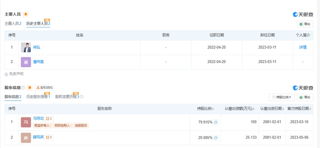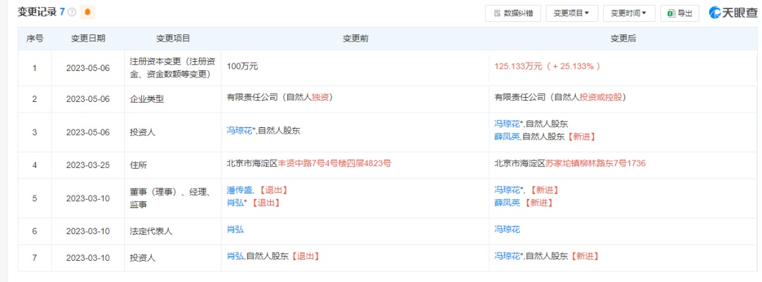 2023年3月10日,该公司股东和法定代表人变更为冯琼花。两个月后,薛凤英成为新进股东,注册资本由100万元增资为125.133万元。当年7月,蝴蝶效应在武汉设立分公司。