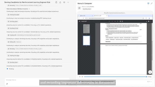 其一是给Manus上传含有10份候选人简历的压缩包,要求Manus帮助筛选简历,Manus在分析指令后会打开一个虚拟机对压缩包进行解压缩,阅读所有简历,然后提供排名建议,并能在用户的要求下生成表格文件,其执行过程通过可视化图形用户界面展示。