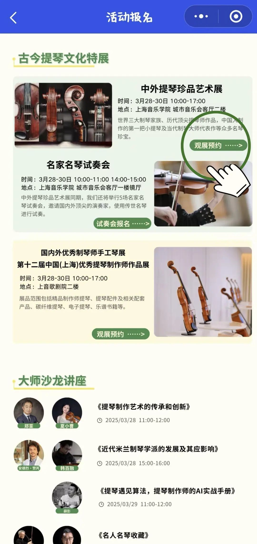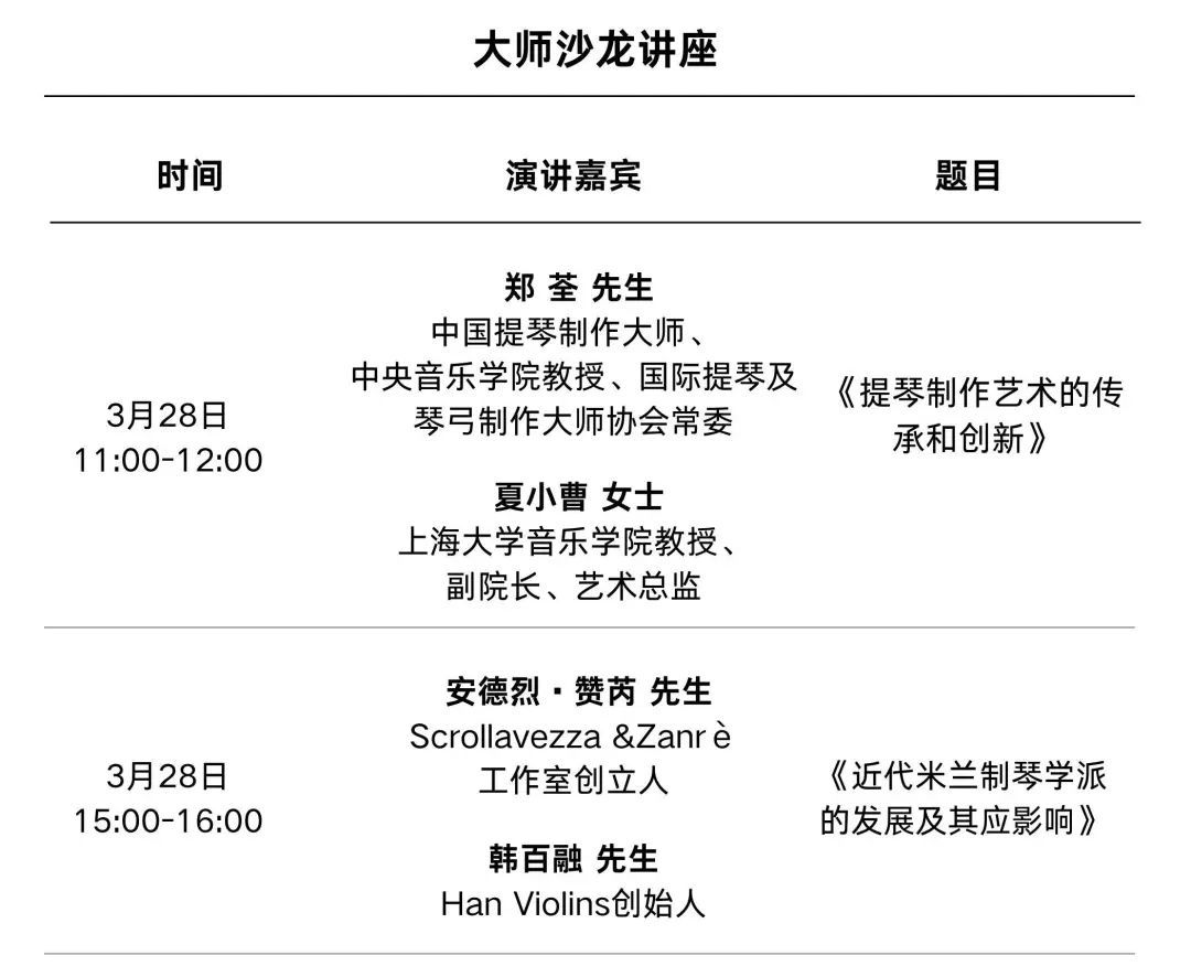 汇聚国内一流的独奏音乐家、重奏组合、制琴大师、教育家等,打造名副其实的当代人文会客厅。在这里,你可以与大师们面对面交流,聆听他们对提琴艺术的深刻见解,还可以欣赏到大师们的精彩演奏,领略提琴音乐的无穷魅力。