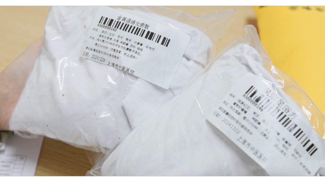 医院风湿病科主任医师陈薇薇为李女士进行诊断后,开具内服中药,并在其合谷穴进行穴位敷贴。随后,陈薇薇对后续就诊的患者薛先生开具了泡洗中药,帮助薛先生缓解“双下肢冷痛,冰冷感明显,时有双膝关节疼痛”问题。