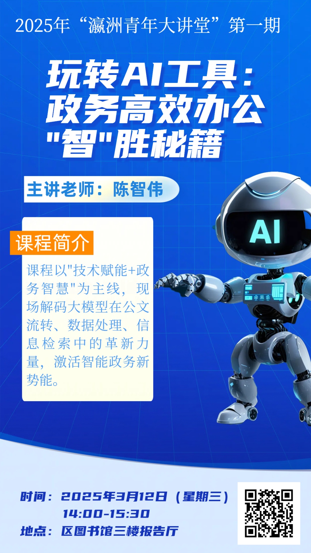 团员青年们请注意 2025年“瀛洲青年大讲堂”之 玩转AI工具:政务高效办公“智”胜秘籍 专题课程来啦 详情如下 培训师资 陈智伟,堡镇人民政府农业农村发展办公室科员,博士毕业于上海财经大学金融信息工程专业,研究方向聚焦金融信用风险控制、自然语言处理等领域。熟练掌握Python、JAVA等编程语言,并熟悉大模型部署与应用相关技能,在数据分析和智能化应用方面具备扎实的理论基础与丰富的实践经验。 培训对象 全区团员青年(100人) 培训时间 2025年3月12日(星期三) 14:00-15:30 培训地点 区图书馆三楼报告厅 (崇明区城桥镇崇明大道7897号) 培训内容 课程以“技术赋能+政务智慧”为主线,现场解码大模型在公文流转、数据处理、信息检索中的革新力量,激活智能政务新势能。 如果你也想解锁AI提效核心秘籍 那就快来报名吧! (报名请扫二维码) 资料:崇明共青团 编辑:焦倩倩