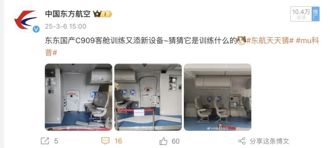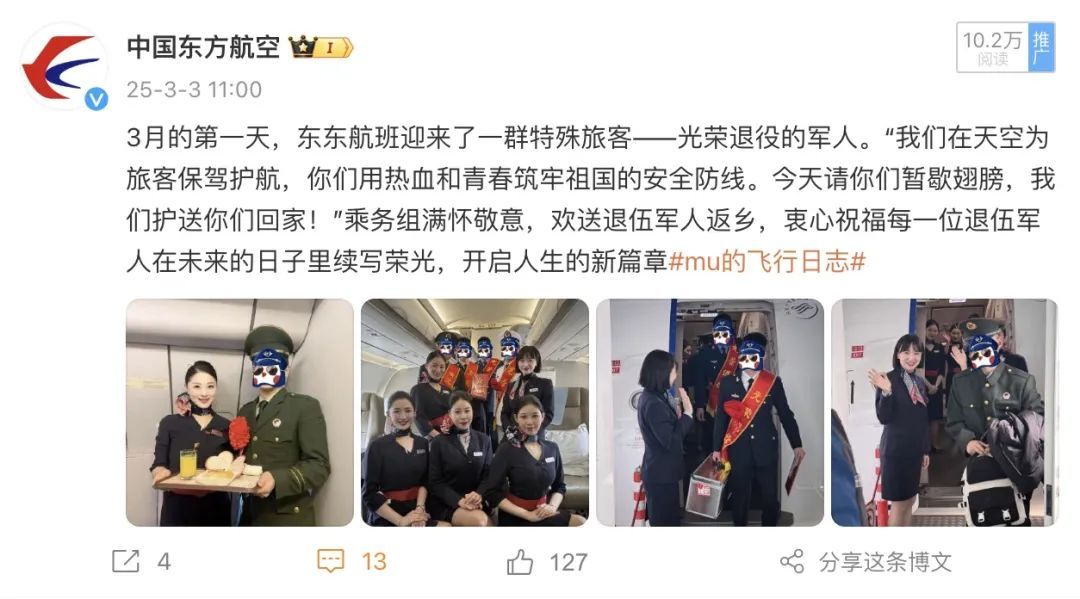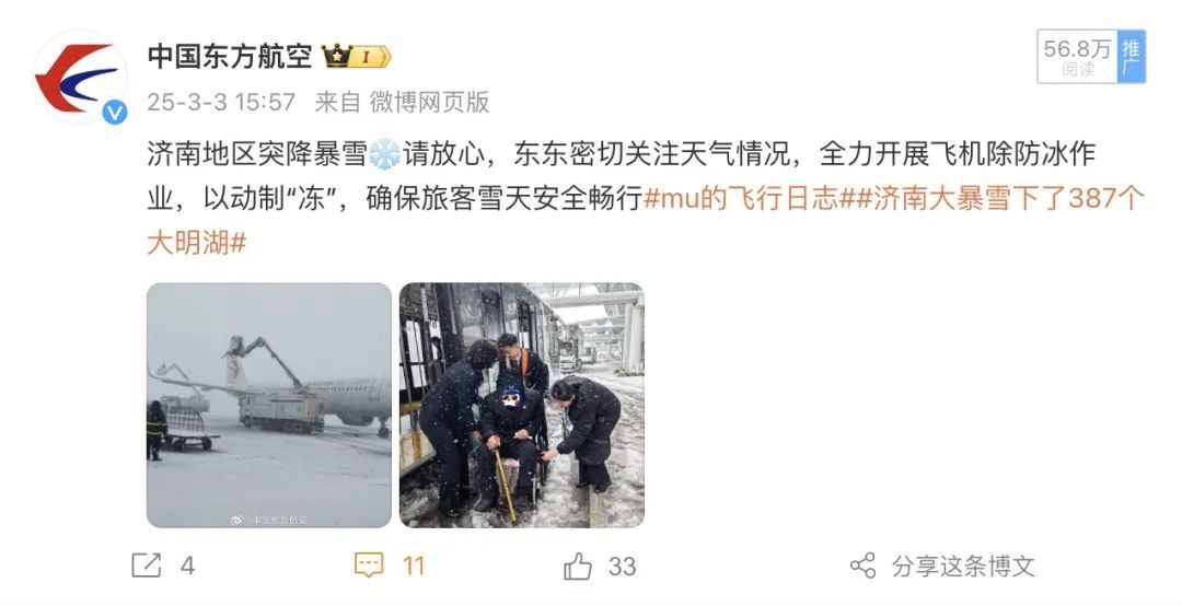 微博共发布30条内容,总流量178.1万。其中,“3月的第一天,东东航班迎来了一群特殊旅客——光荣退役的军人”、“济南地区突降暴雪,东东全力开展飞机除防冰作业,确保旅客雪天安全畅行”、“东东国产C909客舱训练又添新设备~猜猜它是训练什么的”获得了更多的曝光量。