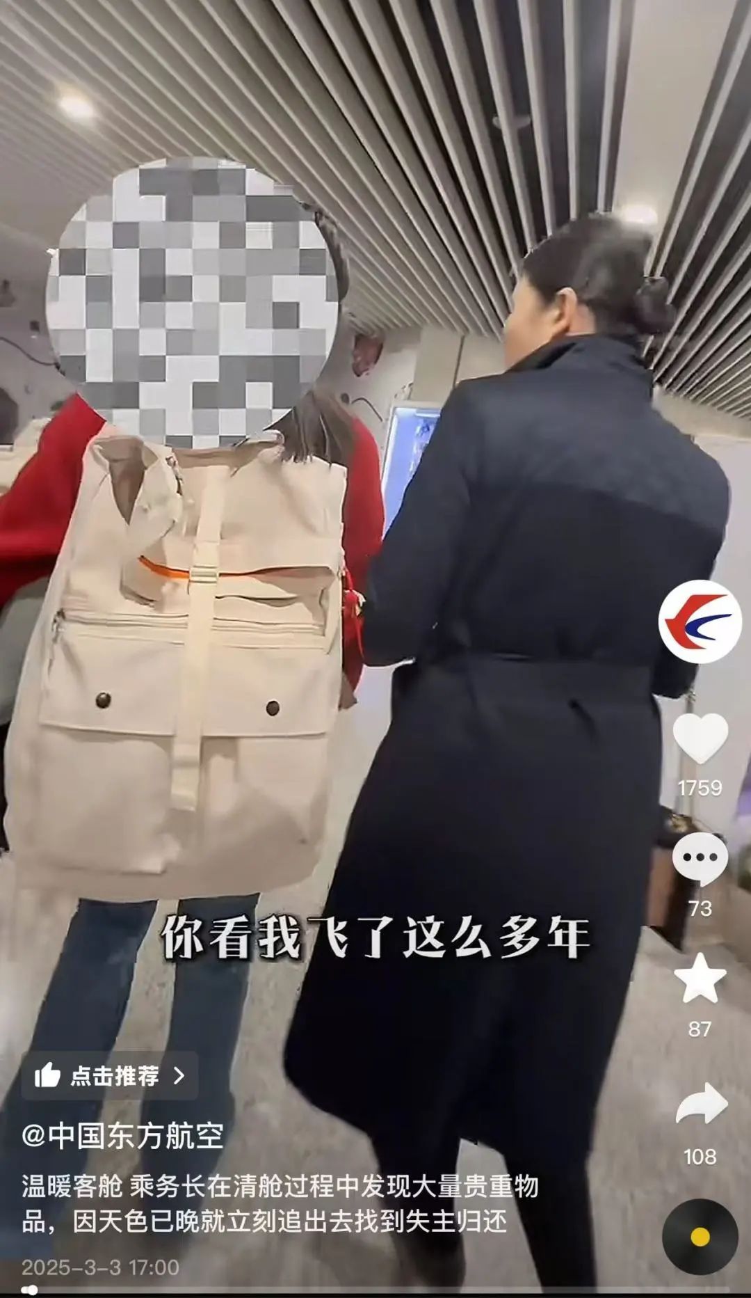 抖音、快手共发布6期内容,总播放量31万。其中“温暖客舱 乘务长在清舱过程中发现大量贵重物品,因天色已晚就立刻追出去找到失主归还”收获了大量关注、互动与点赞。