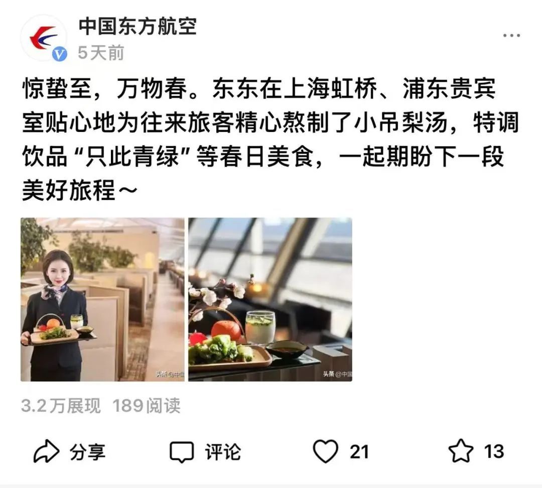 头条号共发布13期内容,总阅读量16.7万。其中“惊蛰至,万物春。东东在上海虹桥、浦东贵宾室贴心地为往来旅客精心熬制了小吊梨汤,特调饮品'只此青绿'等春日美食,一起期盼下一段美好旅程~”收获了更多关注。