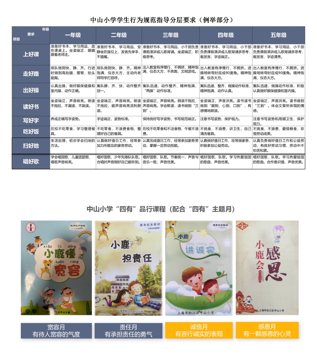 上海市松江区中山小学是一所具有深厚文化底蕴的百年老校,连续多届荣获“上海市中小学行为规范示范校”称号。学校秉承“夯实基础,为每一位孩子的终身幸福奠基”的办学理念,以“言行育德,好习惯伴我成长”为行为规范教育主题,致力于培养具有“三基”素养的景贤学子——即基本品行、基本能力和基本学力。通过构建德育校本课程体系,学校分学段培养学生“四有”品行,“十好”行规。