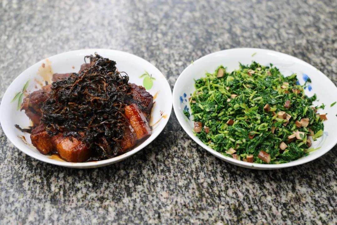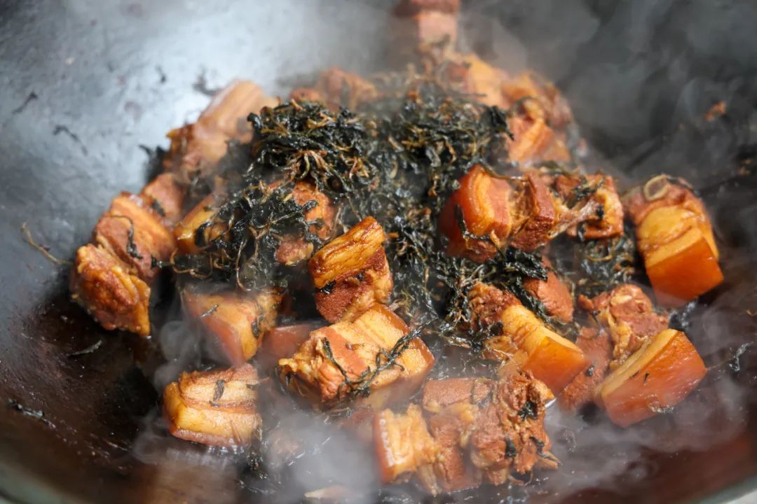 烹饪时,先在热锅中倒入少许食用油,放入葱段、姜片、蒜末爆香,再加入五花肉煸炒至表面金黄,油脂微微渗出。此时加入适量生抽、老抽、冰糖和八角,翻炒均匀,让每一块肉都裹满浓郁的酱汁。接着加入足量清水,大火烧开后转小火慢炖30分钟左右,直至五花肉变得软烂入味。随后,加入马兰头干,继续炖煮5到8分钟。带着淡淡清香的马兰头干,中和了肉的油腻,两者相互搭配,口感层次丰富,令人回味无穷。