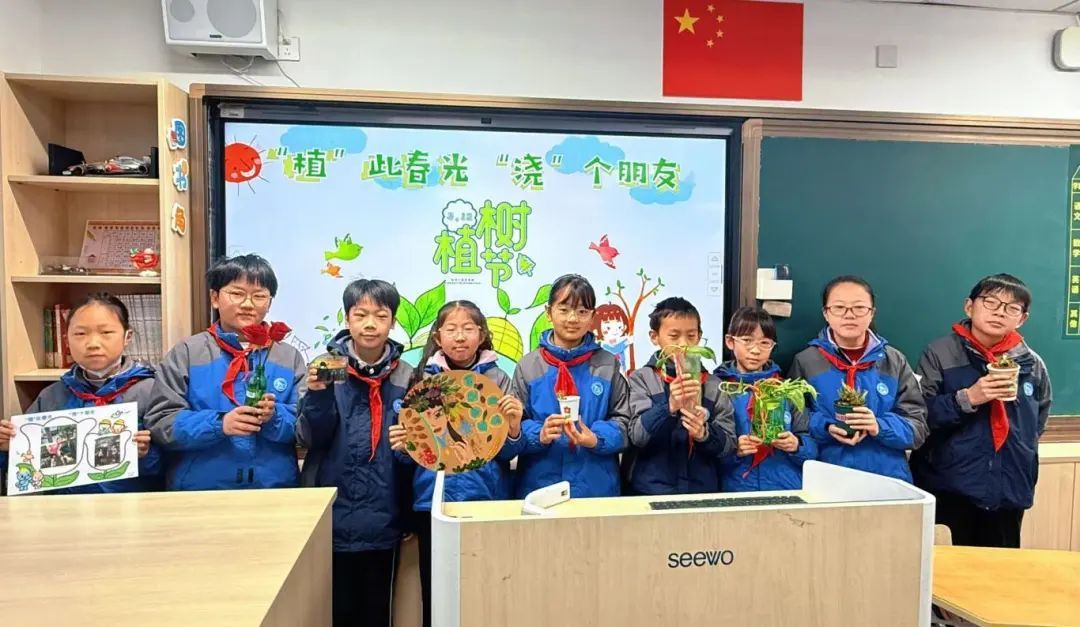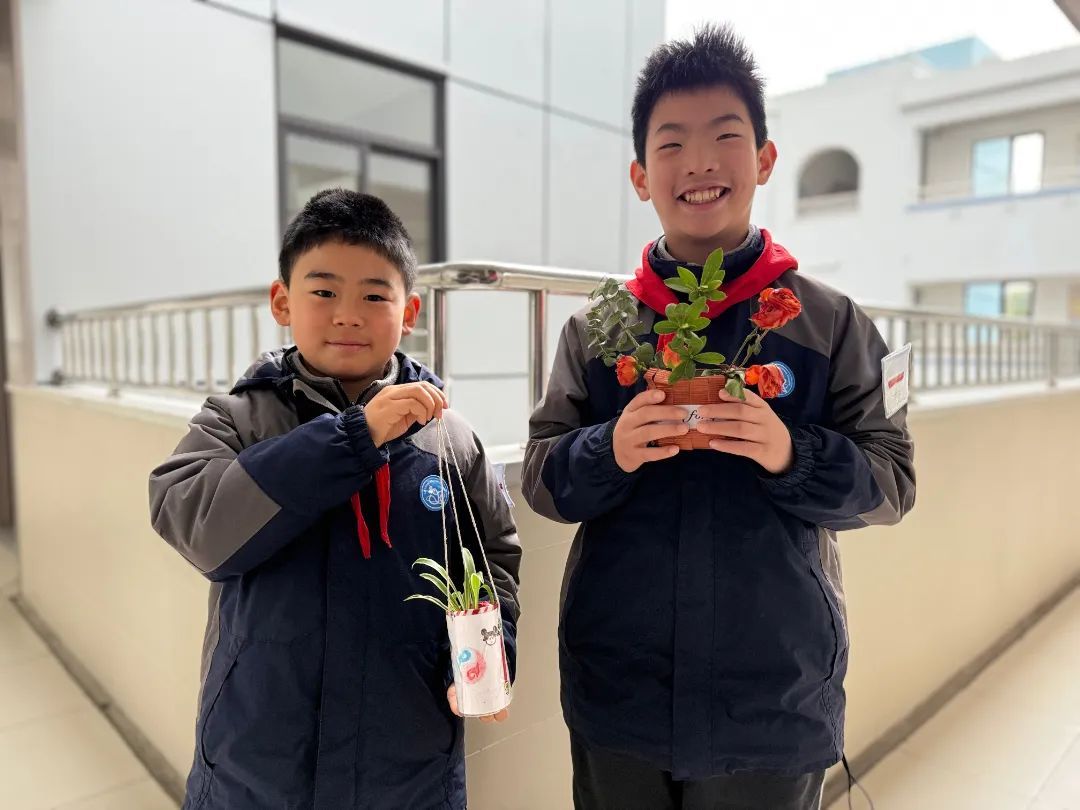 其他年级的同学们有的用废弃饮料瓶、易拉罐、旧木箱等制作花盆,并通过彩绘、剪裁、装饰,让“植物朋友”的外衣焕然一新;有的把京剧脸谱、剪纸元素等融入绿植点缀,使绿植充满了浓浓的中华传统文化特色;还有的用视频记录了自己从挖坑、栽种、浇水到后续养护植物全过程,并拼接成完整的树木成长“拼图”,展现了植树的完整流程与生命成长的延续。无论何种方式,康宁学子们都用行动诠释着爱绿护绿的深刻内涵。