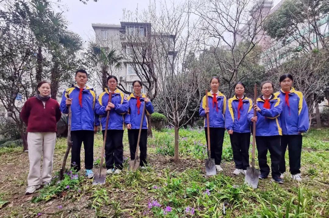 3月10日一早,徐汇区教育学院附属实验中学九年级学生代表与校长杨洁齐聚学校躬耕园,共同种下早樱树苗。师生们齐心协力,手持铁锹铲土、培土、围堰,栽种下校园的“新成员”。