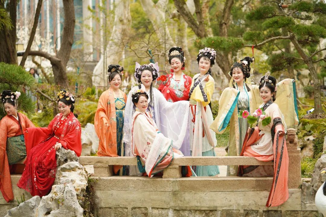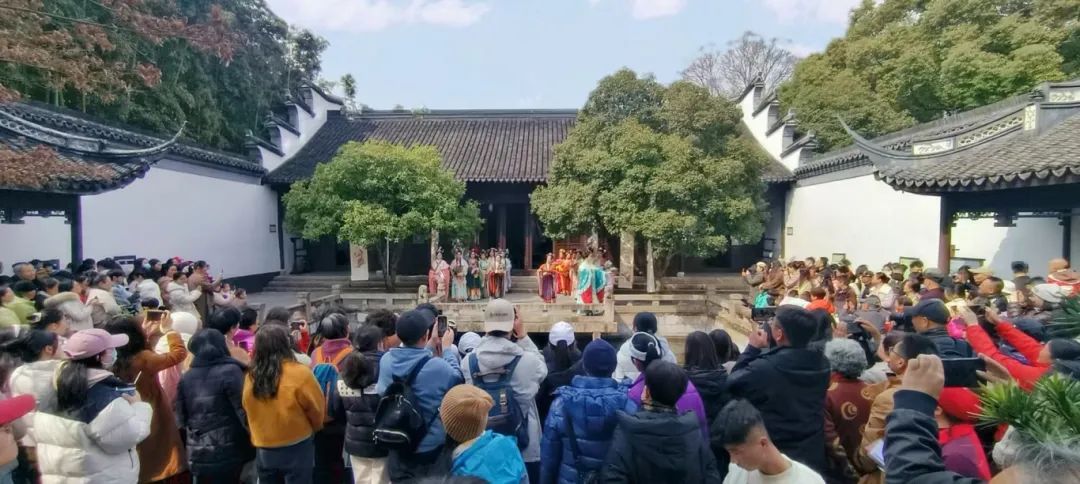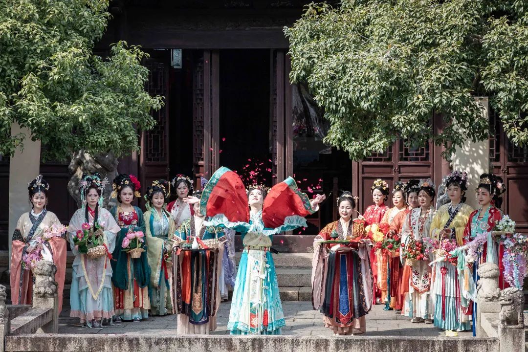 当天下午,来自静安区北站街道北舞泱华汉舞团的舞者扮演着“十二月令花仙”,舞者们身着华丽彩衣,头戴簪饰,手捧花篮,从雪海堂内缓缓步入庭院中央,随着音乐渐起,“兰花花神”和“花仙子”们一起翩翩起舞,轻盈的舞姿如同春风拂过柳枝,又似蝴蝶在花间穿梭,仿佛将春天的气息和生机带到江南园林的每一个角落。“感觉这个活动很有意思,能让大家了解到花朝节的文化习俗,更加感觉到江南园林是花美景也美,更有人文的浪漫气息。”一位游客一边拍照一边说。