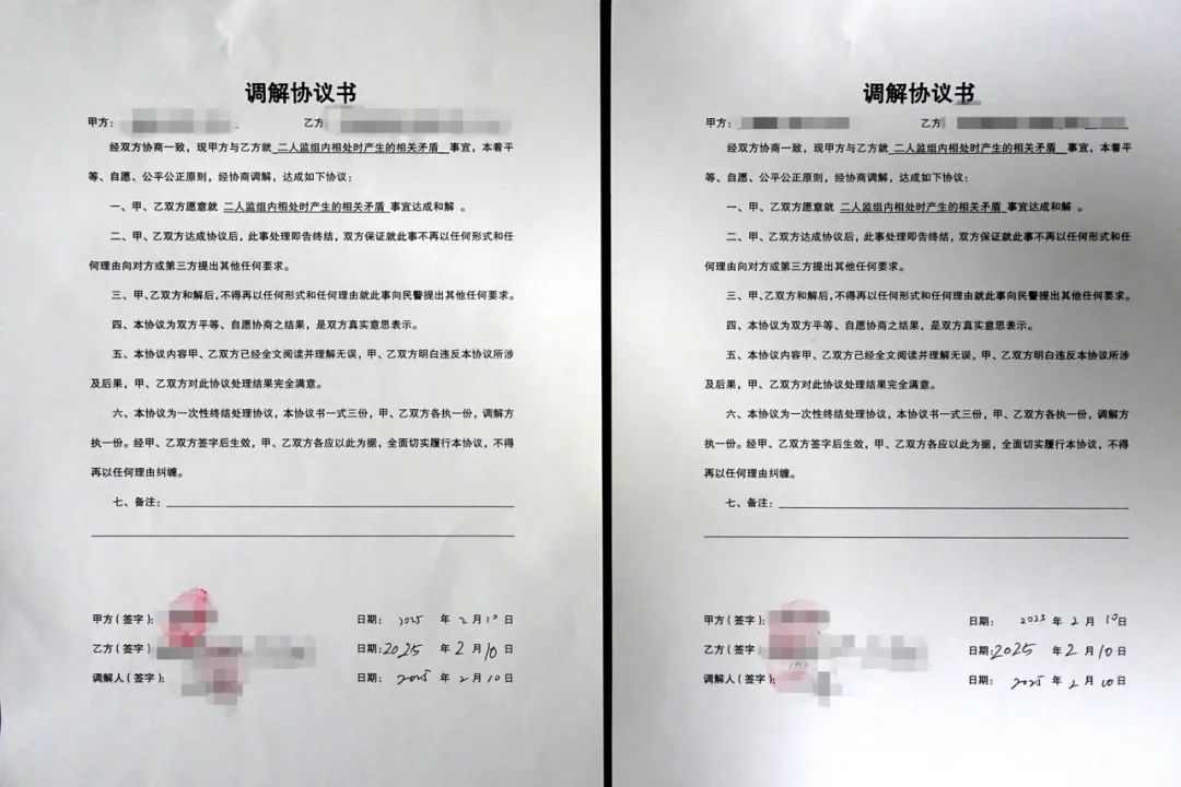 三监区罪犯张某在早晨洗漱时不小心踩了李某的脚,两人随即发生争执,李某扬言报复。为避免冲突升级,民警将二人带至矛盾调处中心,让两人采用背靠背的方式倾诉各自心声,稳定情绪后再面对面交流。民警从双方的兴趣爱好、改造近况着手,帮助他们缓解情绪、打开心扉,细致分析矛盾根源,并引导他们进行理性沟通,从背靠背到面对面,从争锋相对到坦诚相见,最终双方握手言和,达成初步和解,并签署调解协议书。