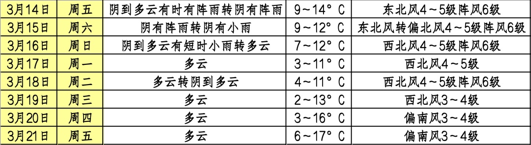 受西南暖湿气流影响,明天夜间到15日降水较明显;另外,受低涡波动和冷空气先后影响,明日起至18日风力较大。近期最低气温在3~9°C,最高气温在11~14°C。