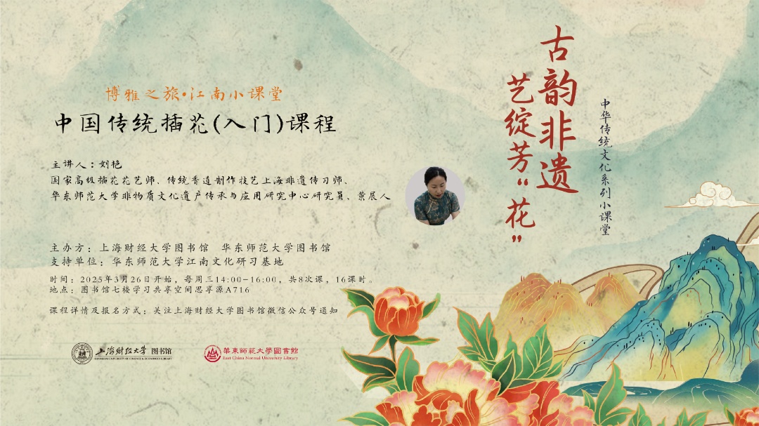 应广大师生需求,上海财经大学图书馆将与华东师范大学图书馆联合推出博雅之旅·江南小课堂系列文化活动。本学期将开设中国传统插花(入门)小课堂,8次课共16课时。