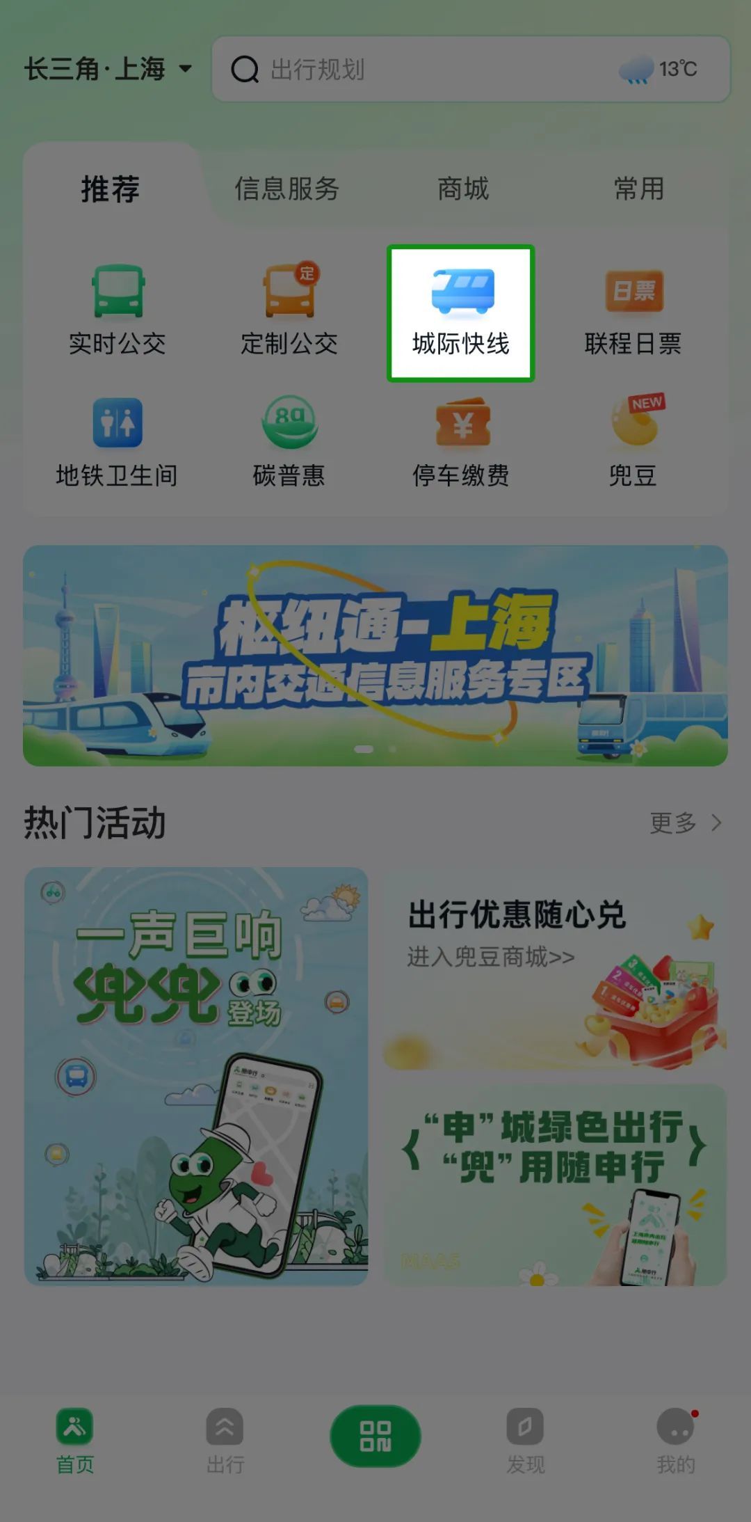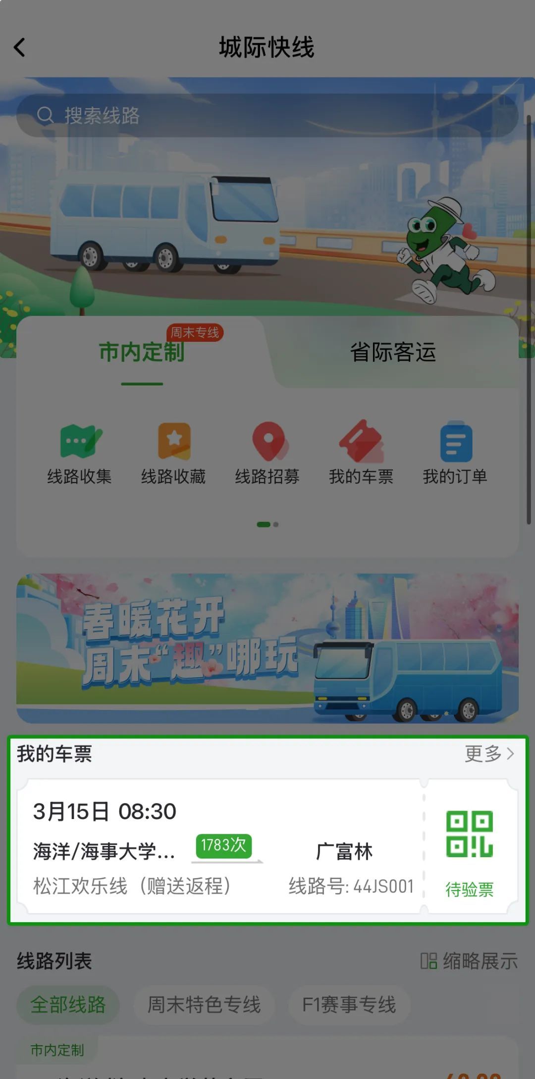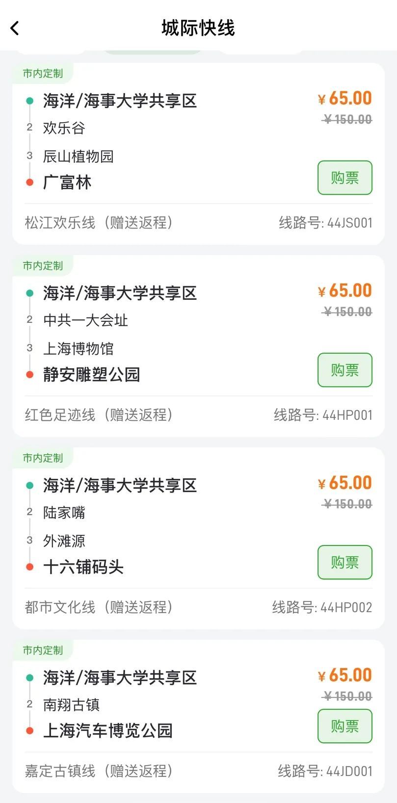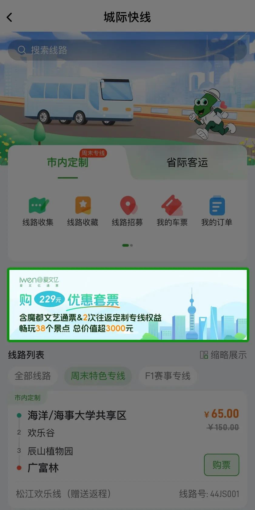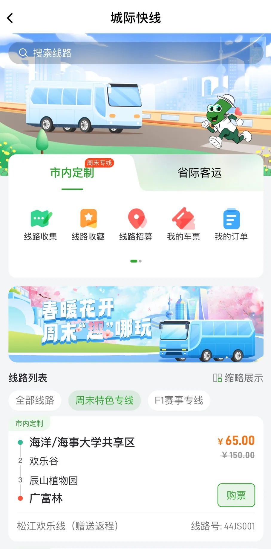 也可登录“随申行”平台(APP&微信小程序)-城际快线,进入市内定制(周末专线)频道