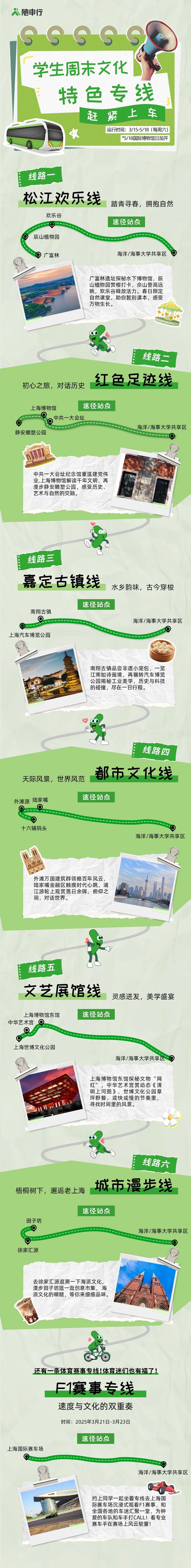 3月15日至5月18日期间,随申行协同运力企业开展“学生周末文化特色专线”的试点运行,率先在临港推出“6+1”条定制专线,从校园直达陆家嘴、梧桐区、博物馆、欢乐谷等城市地标,为高校学子量身定制周末出行服务。详见↓