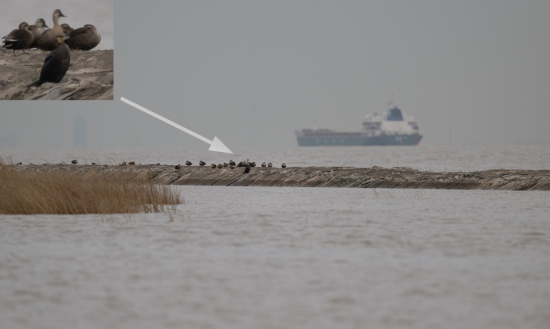 下沙东北侧导堤上斑嘴鸭群旁的暗绿背鸬鹚