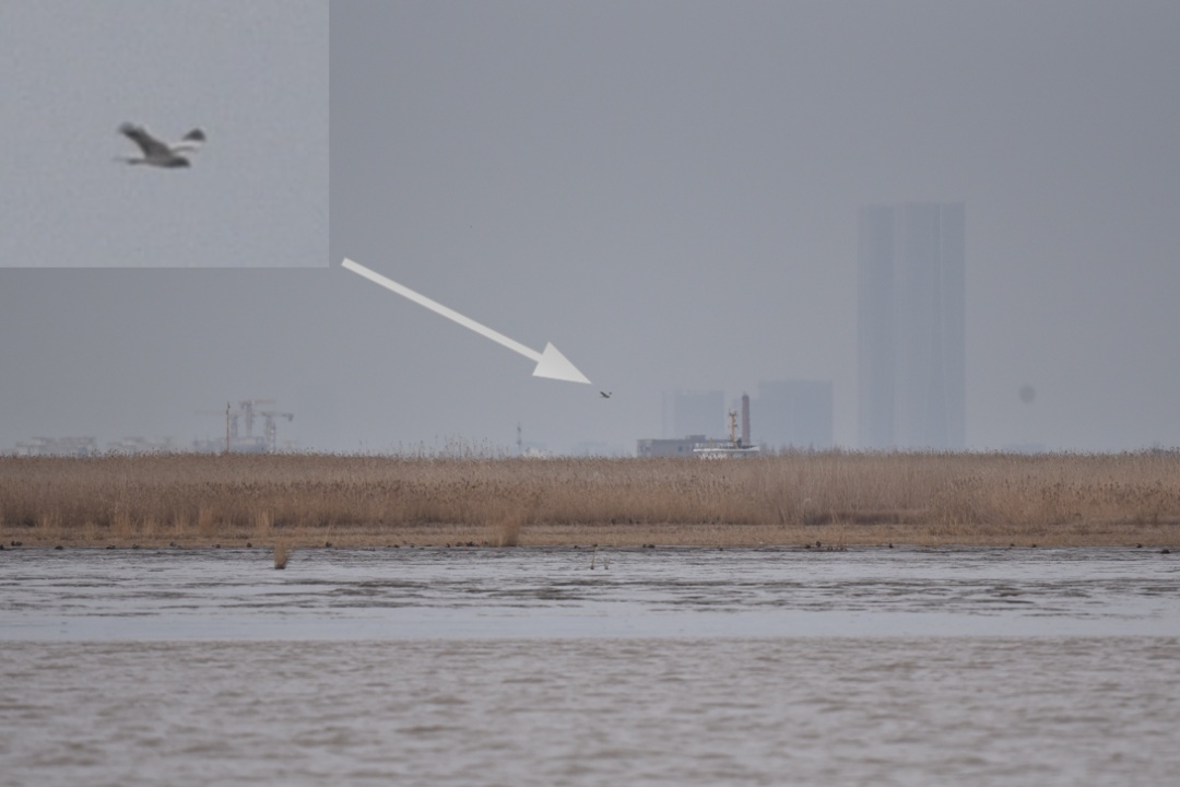现场,调查员在江亚南沙偶遇这只成年雄性鹊鹞。通常情况下,如果距离过远或观察条件不佳,雌性和幼年鹊鹞很容易与保护区鸟类记录中的“常客”白腹鹞,以及出现概率介于两者之间的白尾鹞混淆。但这只鹞黑白分明,背上有着明显的“三叉戟”图案,在远距离也清晰可辨,这一显著特征成为了调查员准确识别它的关键。