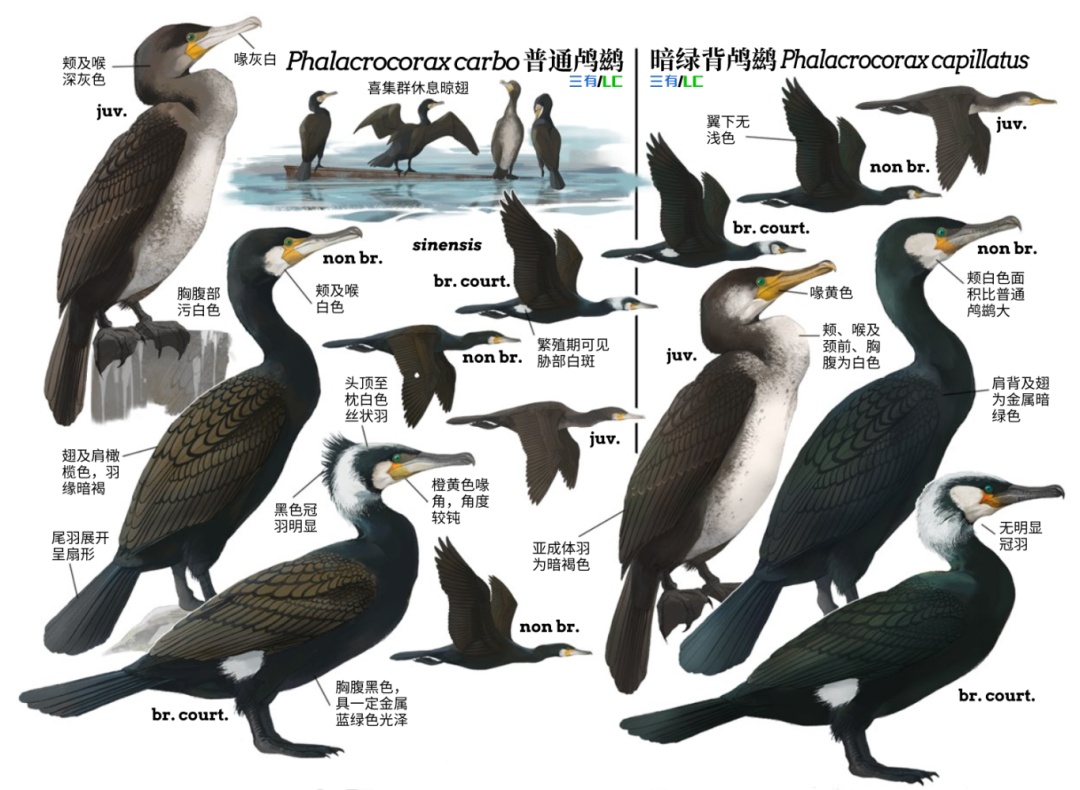 普通鸬鹚与暗绿背鸬鹚的对比