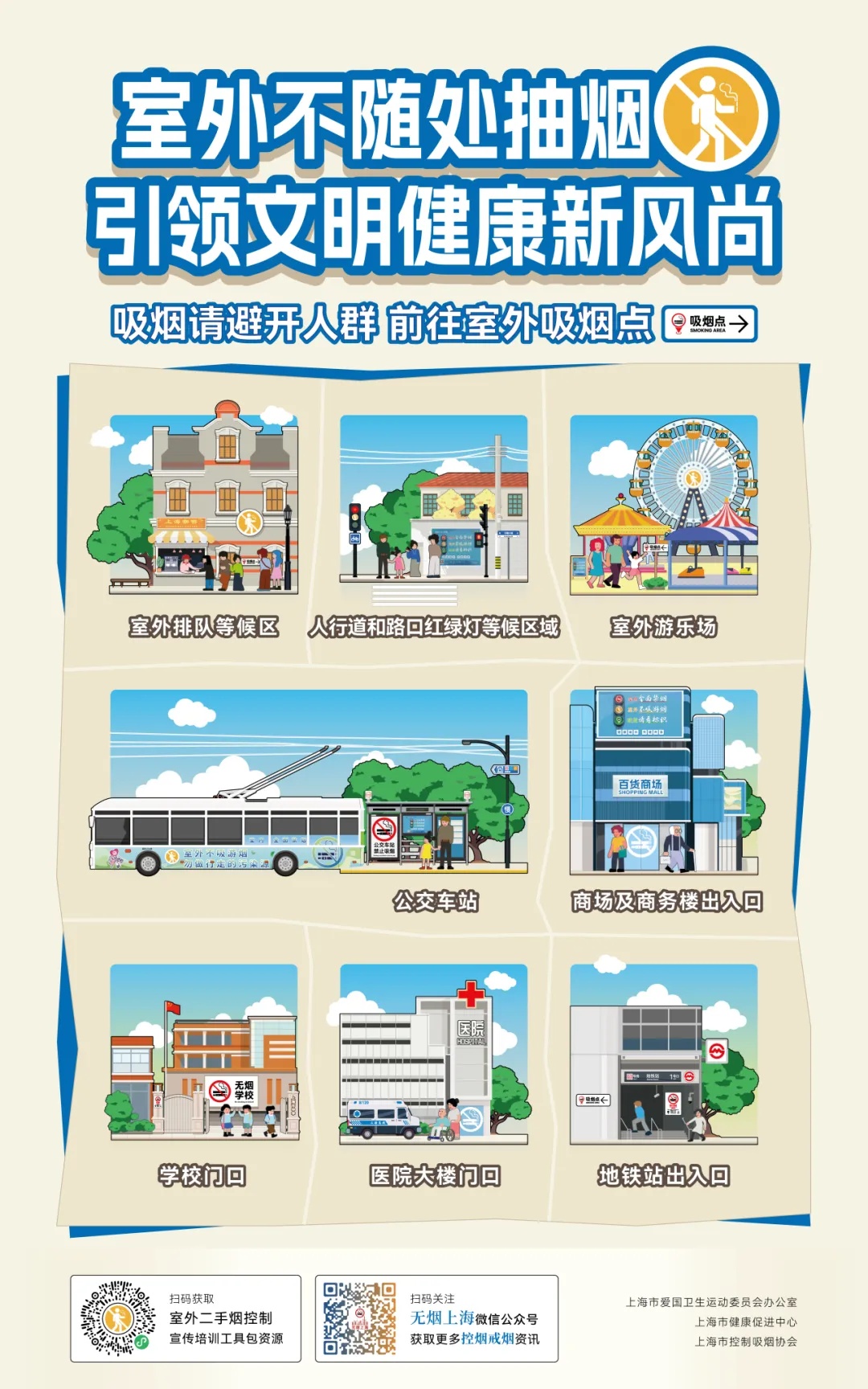 为进一步加强健康城市、人民城市建设,助力优化营商、旅游环境,提升城市文明程度,上海深入推进“控烟行动三部曲”,即“室内全面禁烟、室外不吸游烟、吸烟请看标识”,在加强法定禁烟场所监管执法和宣传倡导的基础上,“疏堵结合”共治室外“游烟”。从3月中旬起,依据九部门联合发文的精神,本市将率先在武康路、豫园商城、新天地、外滩、南京路步行街、陆家嘴商圈、今潮8弄、蟠龙天地等8个中外游客集中、人群密集的“网红”地标场所重点推进,形成示范效应。据了解,这在全国室外场所控烟工作中,也属引领创新之举。