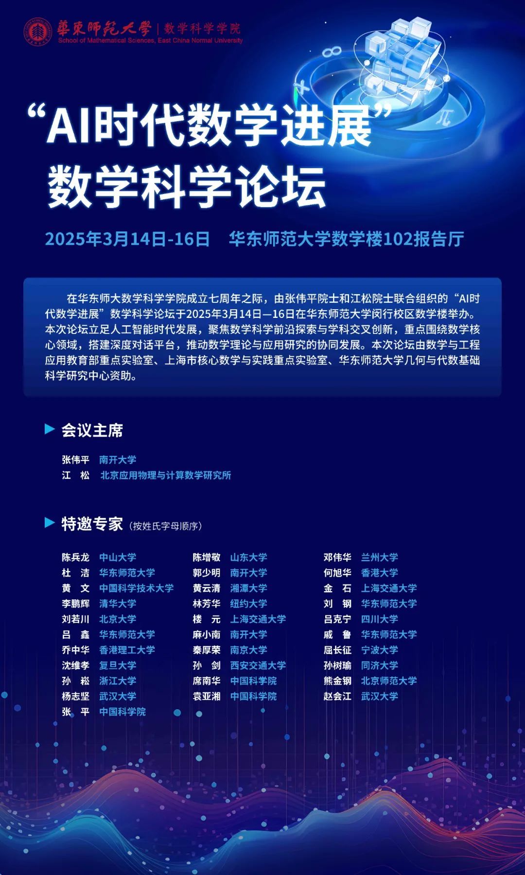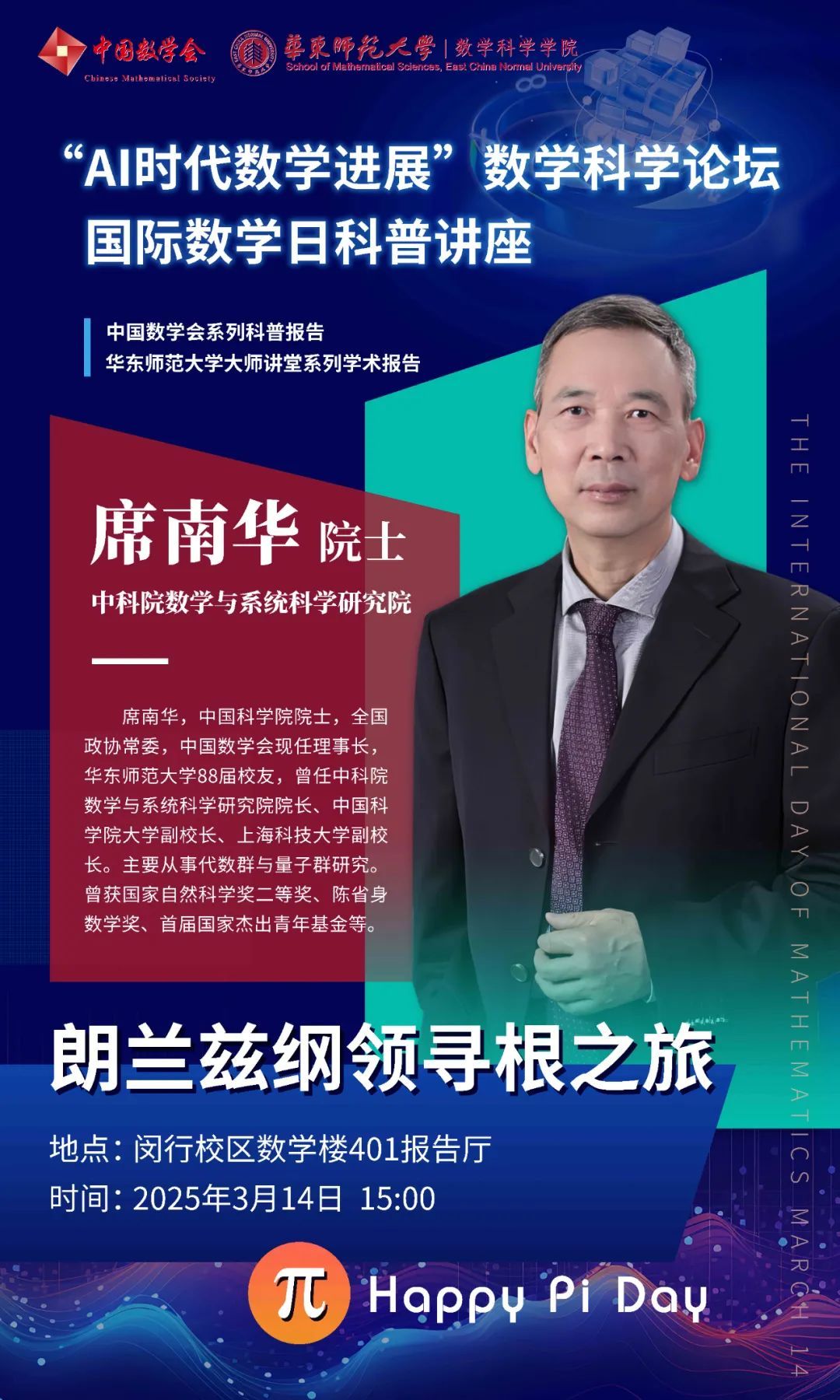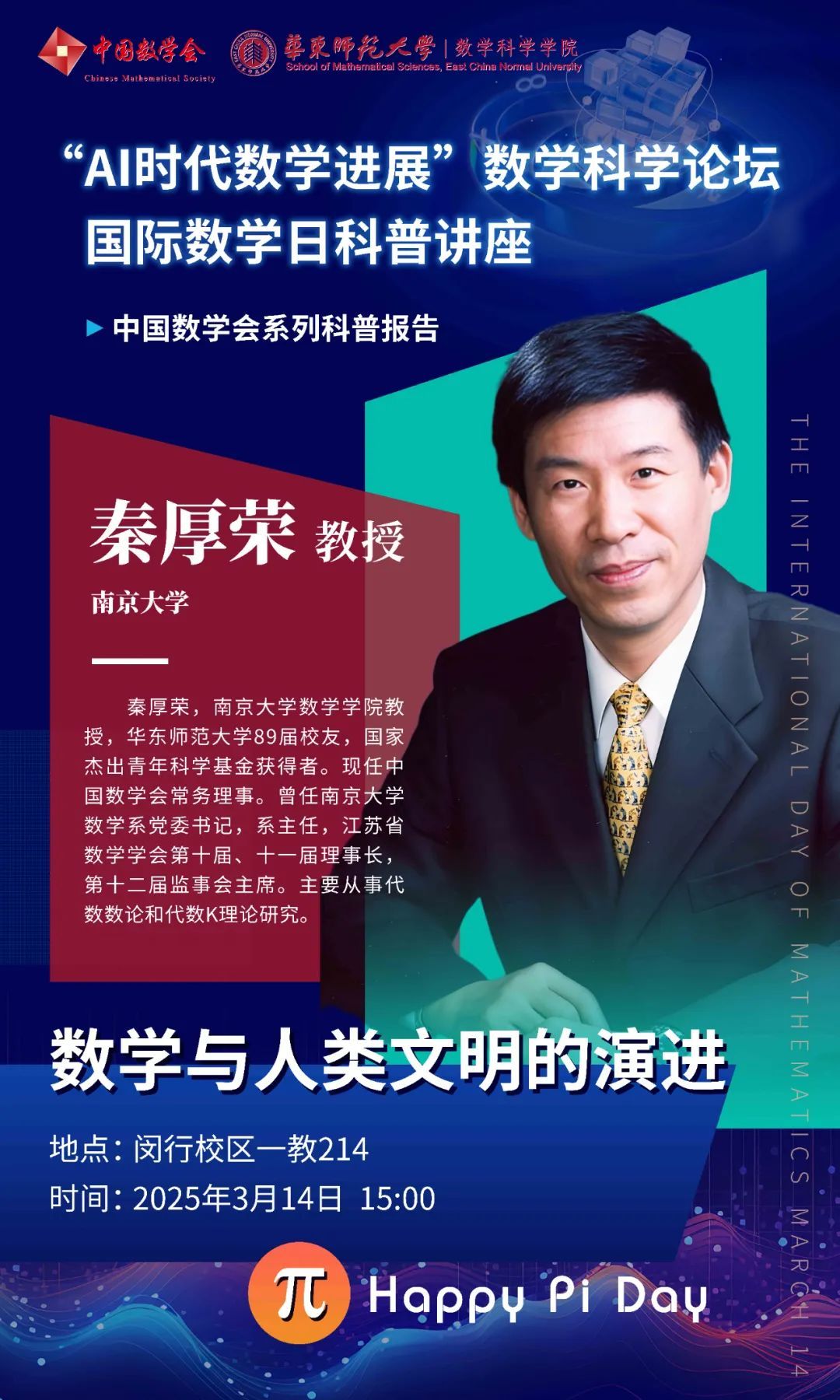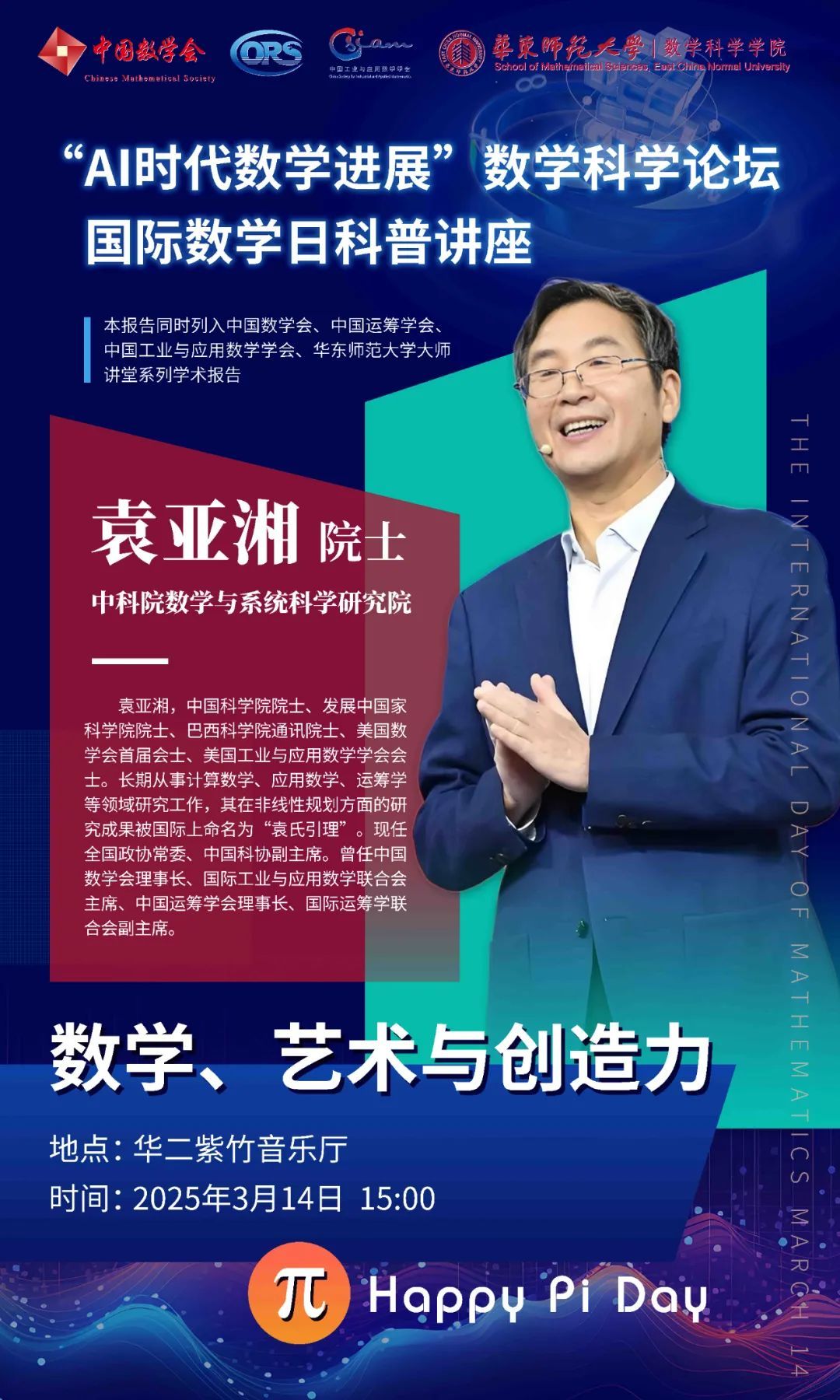 人工智能×圆周率日 公元3世纪 魏晋数学家刘徽首创“割圆术” 首次求得π≈3.1416 2个世纪后 南北朝数学家祖冲之 进一步将π值精确至小数点后第七位 这项记录保持了近千年 现在,每年的3月14日 都会因这个奇妙 π 而被命名为圆周率日(国际数学日) 当圆周率日(国际数学日) 叠加华东师范大学 数学科学学院七周年院庆 数理长河与未来星辰澎湃联结 来自千年圆周率的凝视 和AI巨浪对人类认知边疆的重塑 在今天的华东师大校园 以一场场数学与智能时代的深度对话 上演群星闪耀的碰撞 邀您共探未来