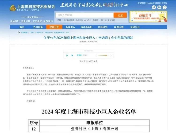 近日,上海市科学技术委员会、上海市经济和信息化委员会、上海市财政局联合公布了2024年度上海市科技小巨人(含培育)企业名单。其中,静安大宁功能区企业壹沓科技凭借卓越的科技创新实力和行业影响力,成功荣登榜单,获“2024年度上海市科技小巨人企业”称号。