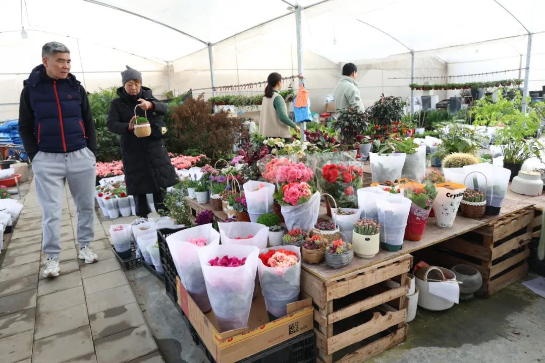 虽然是工作日,但基地里的顾客依然络绎不绝,他们挑选着各式各样的绿植,兴致勃勃地讨论着摆在家里哪个角落好看。“我在里面逛了好久,最后选了几盆多肉,圆滚滚、肉乎乎的,超级可爱。还买了一盆郁金香,看着就觉得充满活力。”一位阿姨和老伴正在认真挑选着心仪的花,准备买回家装饰客厅。