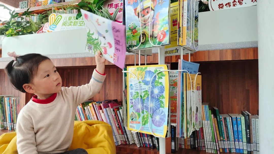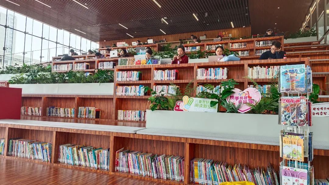 在三楼的阶梯式图书馆,大家三三两两安静地坐着,沉浸在书的世界里。在图书馆的一角,特别设置了儿童友好空间。各类绘本、童话故事书、科普启蒙读物琳琅满目。